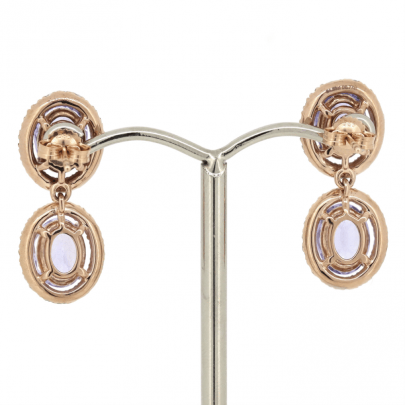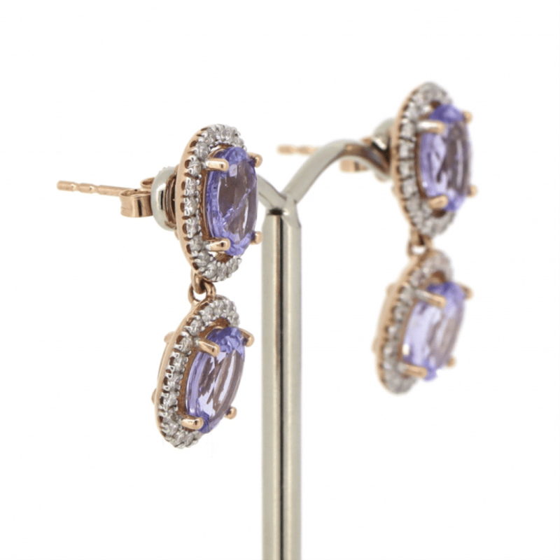14K ROSE GOLD, TANZANITE AND DIAMOND, HALO DOUBLE DROP EARRINGS. The Design Features, 4 Oval Faceted, Medium Purplish-Blue, Tanzanites (4.88Ct Tsw, Slightly Included-Included), 4 Claw Set. Surrounding The Centres In Halos Are, 80 Round Brilliant Cut, Diamonds (0.77Ct Tdw, I-K Colour, Si2-P2 Clarity), Claw Set. The Earrings Have Post Backs, With 14K Rose Gold Butterfly Clasps. Valuations Provided by an Independent Third-Party Professional Not Directly Associated With Lloyds Auctions at AUD $$10,250.00This valuation has been conducted by an independent third-party professional. The valuation amount is an assessment by the issuing valuer and does not reflect the auction value of the item. Any inquiries regarding the valuation should be directed to the issuing valuer (refer to contact details on the certificate), as Lloyds Auctions has no affiliation or influence over the valuation, the valuer, or the stated amount. Condition: Good - Refer Images 0645975+66