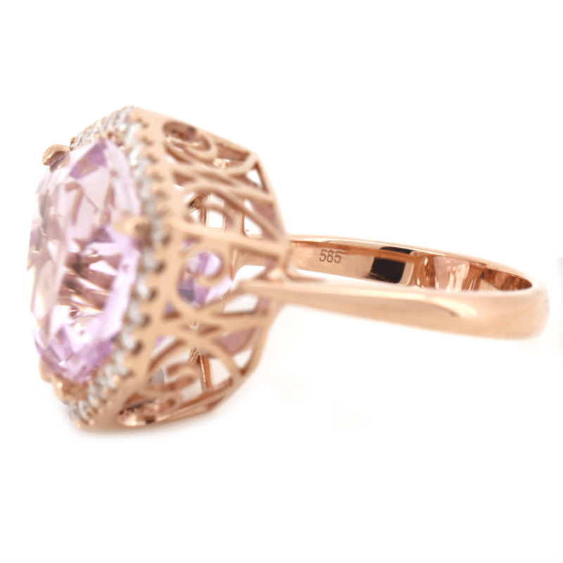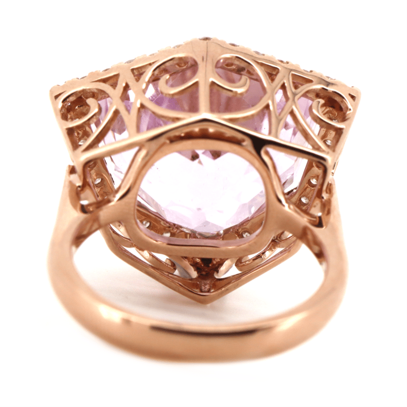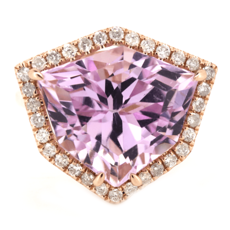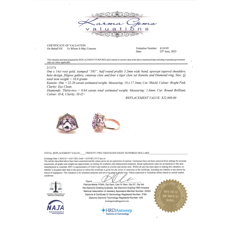 14K ROSE GOLD, 22.20CT KUNZITE AND DIAMOND, STATEMENT RING. The Centres Feature, One Shield Cut, Bright Pink, Kunzite (22.20Ct, Eye Clean), Claw Set. Encompassing The Centre In A Halo Are, 32 Round Brilliant Cut, Diamonds (0.64Ct Tdw, H-K Colour, Si-I2+ Clarity), Claw Set. Ring Size Q. Valuations Provided by an Independent Third-Party Professional Not Directly Associated With Lloyds Auctions at AUD $$22,800.00This valuation has been conducted by an independent third-party professional. The valuation amount is an assessment by the issuing valuer and does not reflect the auction value of the item. Any inquiries regarding the valuation should be directed to the issuing valuer (refer to contact details on the certificate), as Lloyds Auctions has no affiliation or influence over the valuation, the valuer, or the stated amount. Condition: Good - Refer Images 0645975+71