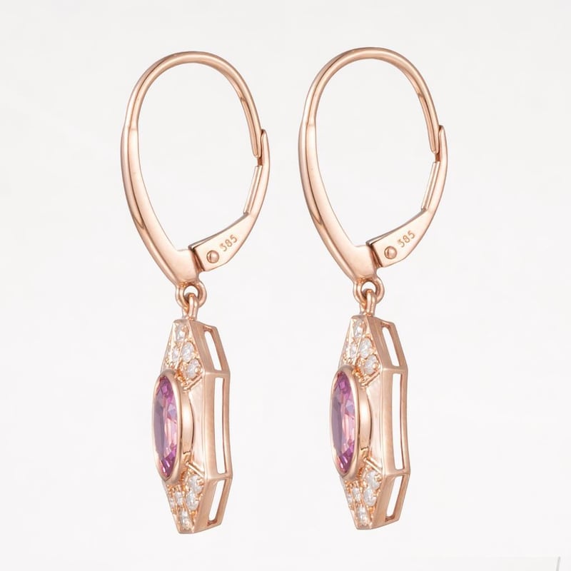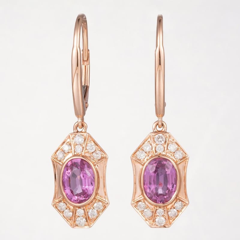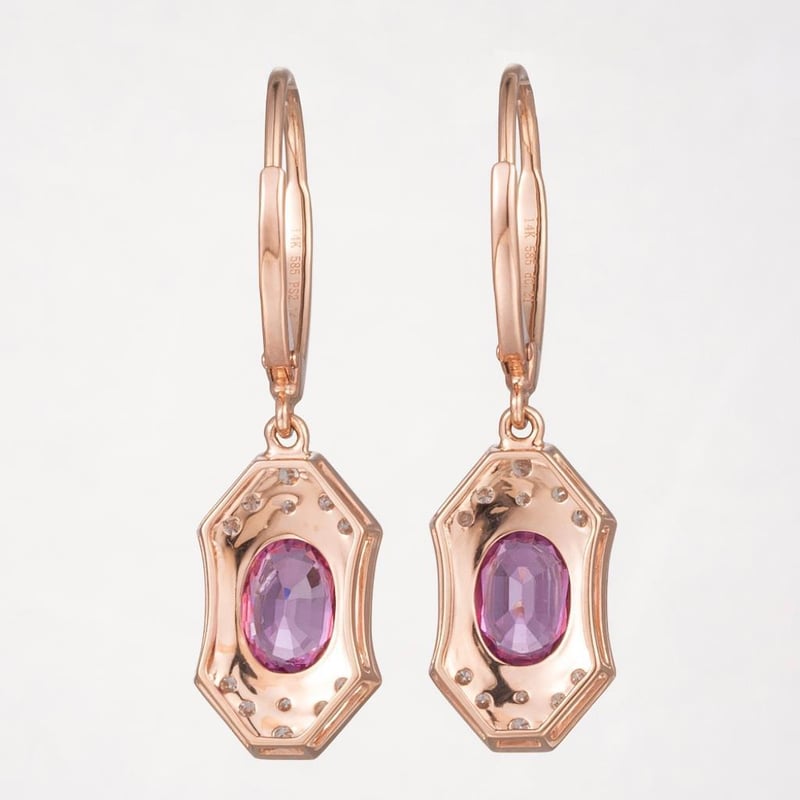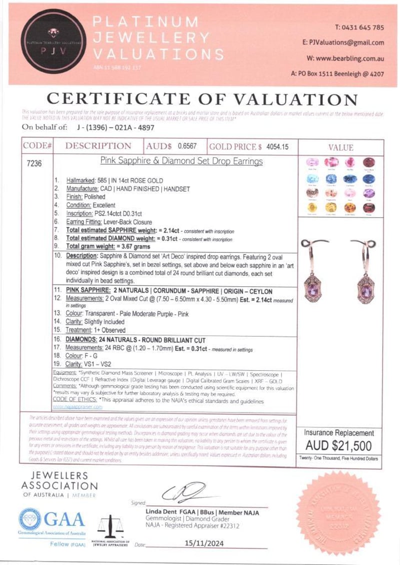 14CT ROSE GOLD PINK CEYLON SAPPHIRE AND DIAMOND DROP EARRINGS Featuring Centre, 2 Oval Mixed Cut, Pale Moderate Purple-Pink Ceylon Sapphires (2.14Ct Tsw, Slightly Included), Bezel Set, With 24 Round Brilliant Cut Diamonds (0.31Ct Tdw, F-G Colour, Vs1-Vs2 Clarity), Bead Set. Valuations Provided by an Independent Third-Party Professional Not Directly Associated With Lloyds Auctions at AUD $21500This valuation has been conducted by an independent third-party professional. The valuation amount is an assessment by the issuing valuer and does not reflect the auction value of the item. Any inquiries regarding the valuation should be directed to the issuing valuer (refer to contact details on the certificate), as Lloyds Auctions has no affiliation or influence over the valuation, the valuer, or the stated amount. Condition: Good - Refer Images 0584555+2209