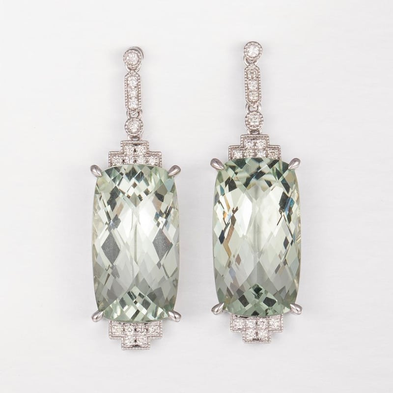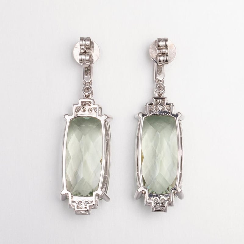 9CT WHITE GOLD GREEN AMETHYST AND DIAMOND DROP EARRINGS Featuring, 2 Elongated Cushion Checkerboard Cut, Pale Green Amethysts (15.50Ct Tsw, Eye Clean), Claw Set, With 34 Round Brilliant Cut Diamonds (0.18Ct Tdw, H-I Colour, Si1-I1 Clarity), Bezel/Bead Set. Valuations Provided by an Independent Third-Party Professional Not Directly Associated With Lloyds Auctions at AUD $20000This valuation has been conducted by an independent third-party professional. The valuation amount is an assessment by the issuing valuer and does not reflect the auction value of the item. Any inquiries regarding the valuation should be directed to the issuing valuer (refer to contact details on the certificate), as Lloyds Auctions has no affiliation or influence over the valuation, the valuer, or the stated amount. Condition: Good - Refer Images 0584555+2197