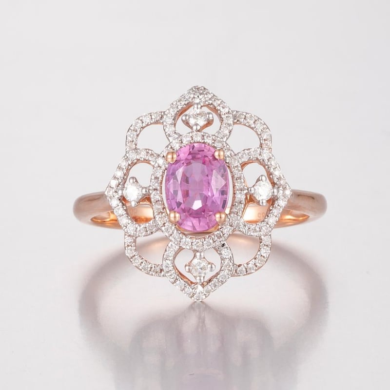 Featuring Centre, One Oval Cut, Vivid Purplish Pink Sapphire (0.99Ct, Slightly Included), Claw Set, With 98 Round Brilliant Cut Diamonds (0.25Ct Tdw, G-H Colour, Vs1-Vs2 Clarity), Bead Set. Ring Size O.