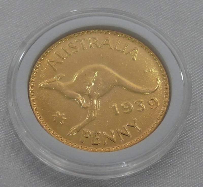 1939 KGVI UNCIRCULATED 18CT. GOLD PLATED AUSTRALIAN PENNY IN PROTECTIVE CLEAR CAPSULE. 488547+11