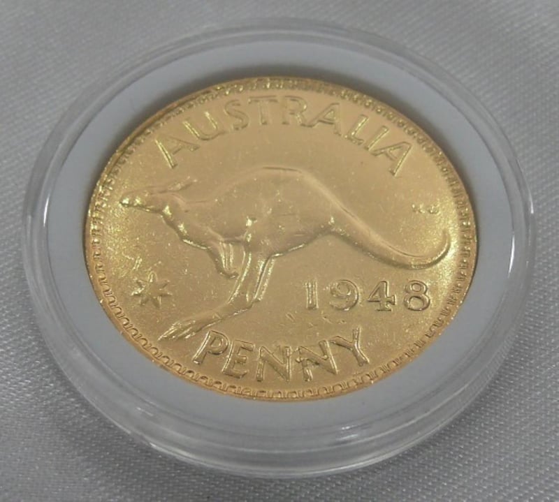 1948 KGVI UNCIRCULATED 18CT. GOLD PLATED AUSTRALIAN PENNY IN PROTECTIVE CLEAR CAPSULE. 488547+14