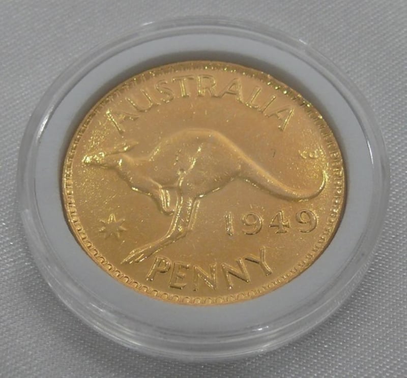1949 KGVI UNCIRCULATED 18CT. GOLD PLATED AUSTRALIAN PENNY IN PROTECTIVE CLEAR CAPSULE. 488547+15