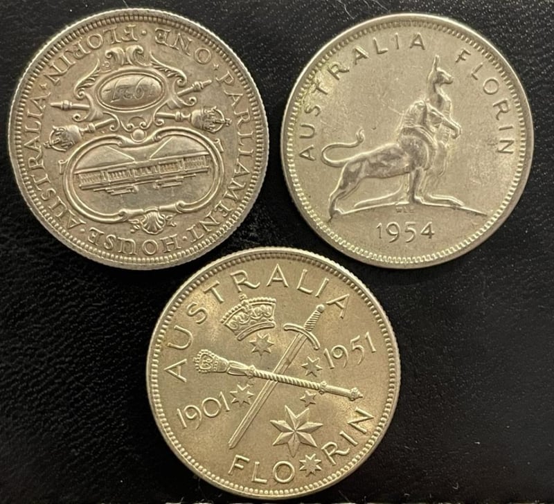 AUSTRALIAN COMMEMORATIVE SILVER FLORIN SET - 3 COINS 1927 Canberra 0.927 Silver, 1951 And 1954 0.500 Silver 488550+6