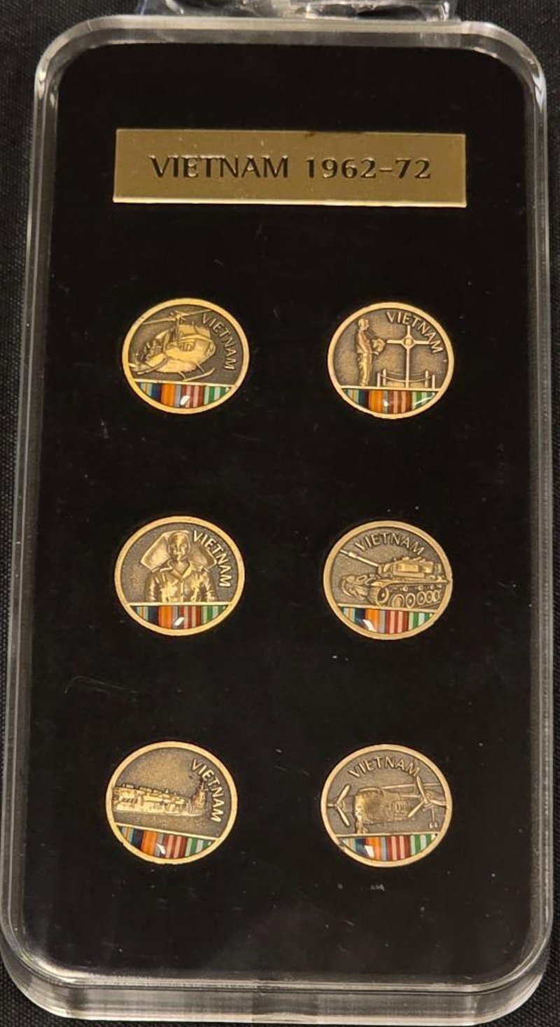 A Significant Historical Commemorative Set Honouring Australian Involvement In The Vietnam Conflict From 1962-1972. The Set Comprises Six Enamel And Gilt Medals Mounted In A Clear Acrylic Case With Black Presentation Backing. Each Medal Features The Vietnam Inscription And Incorporates Campaign Ribbon Colours (Red, Yellow, Green, And Purple Stripes).