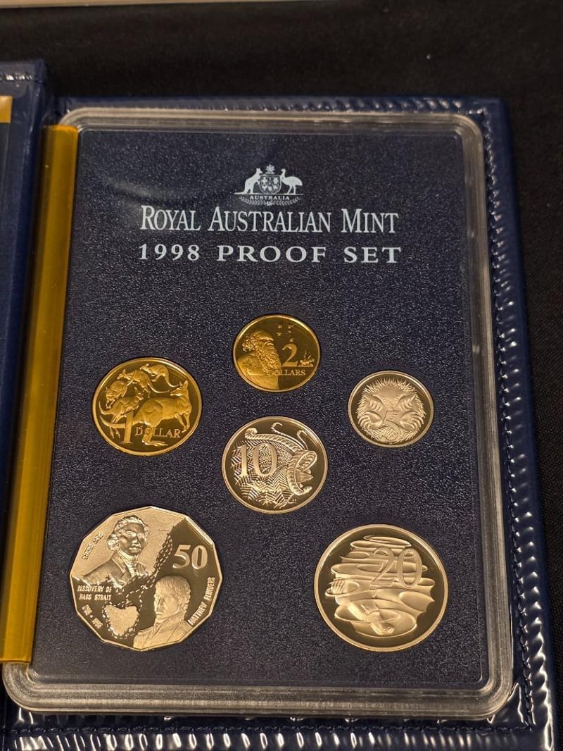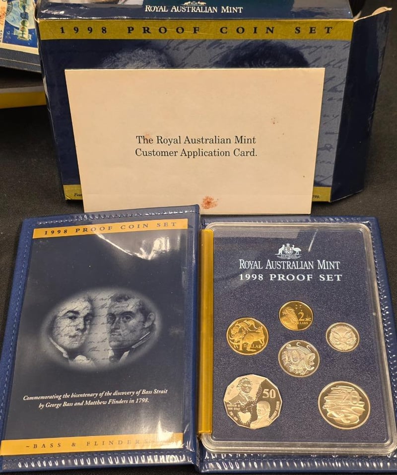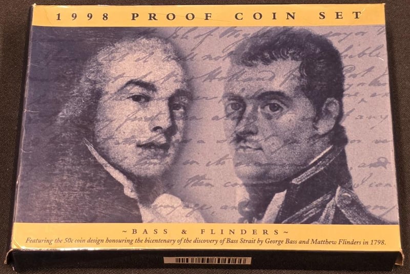 This Royal Australian Mint 1998 Proof Coin Set Is A Commemorative Collection Featuring Six Proof Coins In Gold And Silver Finishes. The Set Includes A $1 Coin Depicting Australian Wildlife, A $2 Coin, A 20¢ Coin, A 10¢ Coin, A 5¢ Coin, And A Distinctive 50¢ Commemorative Coin Honouring The Bicentenary Of The Discovery Of Bass Strait By George Bass And Matthew Flinders In 1798.