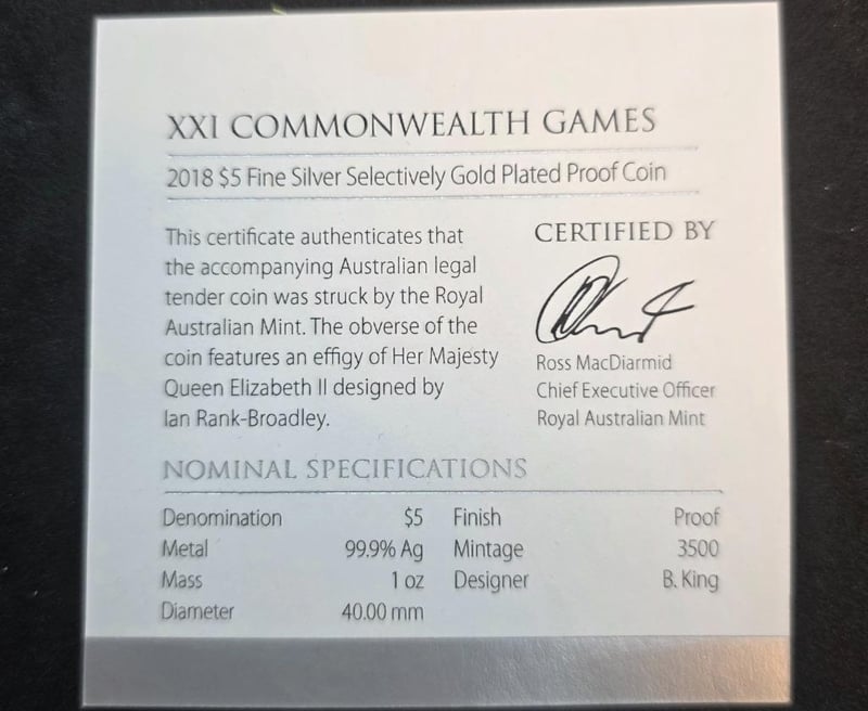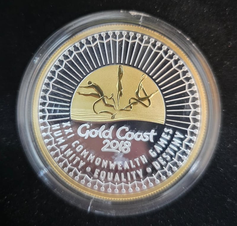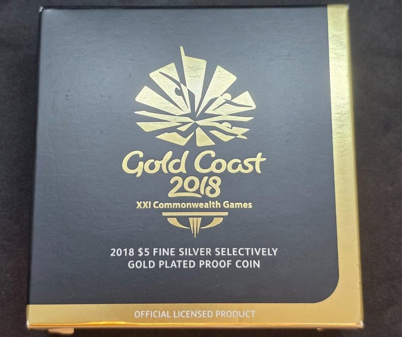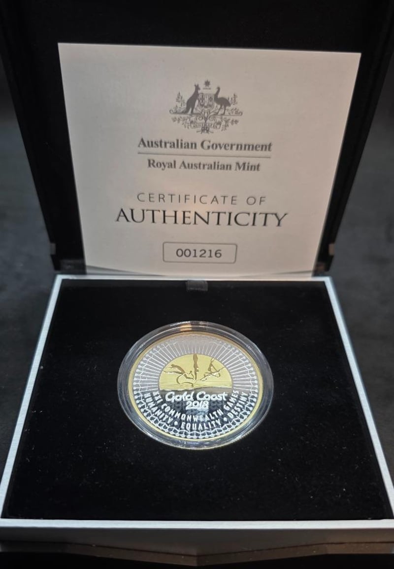 2018 GOLD COAST SILVER 5 DOLLAR GOLD PLATED PROOF COIN COMMONWEALTH GAMESIncludes Coa, Mintage: 1216/3500.Condition: Unc584470+17