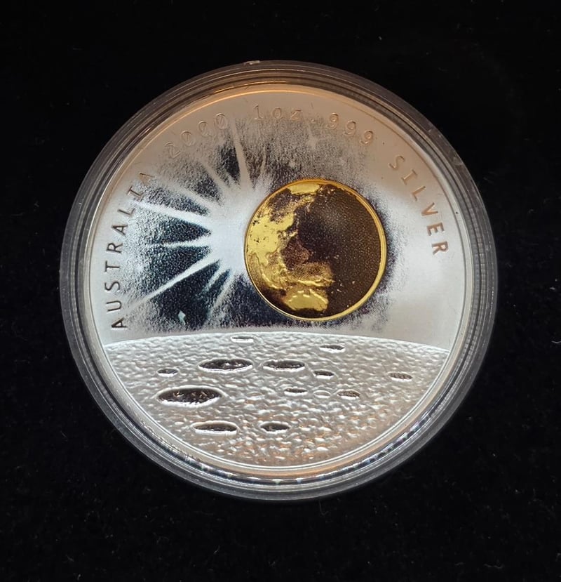 This Design Is To Commemorate The New Millennium, Featuring The Three Heavenly Bodies - The Moon, The Earth And The Sun. In The Foreground Is A Textured Surface Of The Moon. 99.9% Pure Silver One Ounce One Dollar Proof. Encapsulated And Cased.