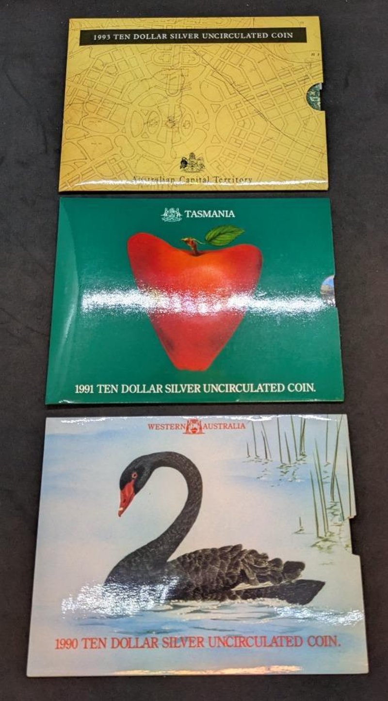 COLLECTION OF ROYAL AUSTRALIAN MINT TEN DOLLAR SILVER UNCIRCULATED COINS (1990-1993)Districts Include 1990 Western Australia Coin, 1991 Tasmania Coin And 1993 Australian Capital Territory CoinCondition: UncProvenance: Royal Australian Mint584470+24