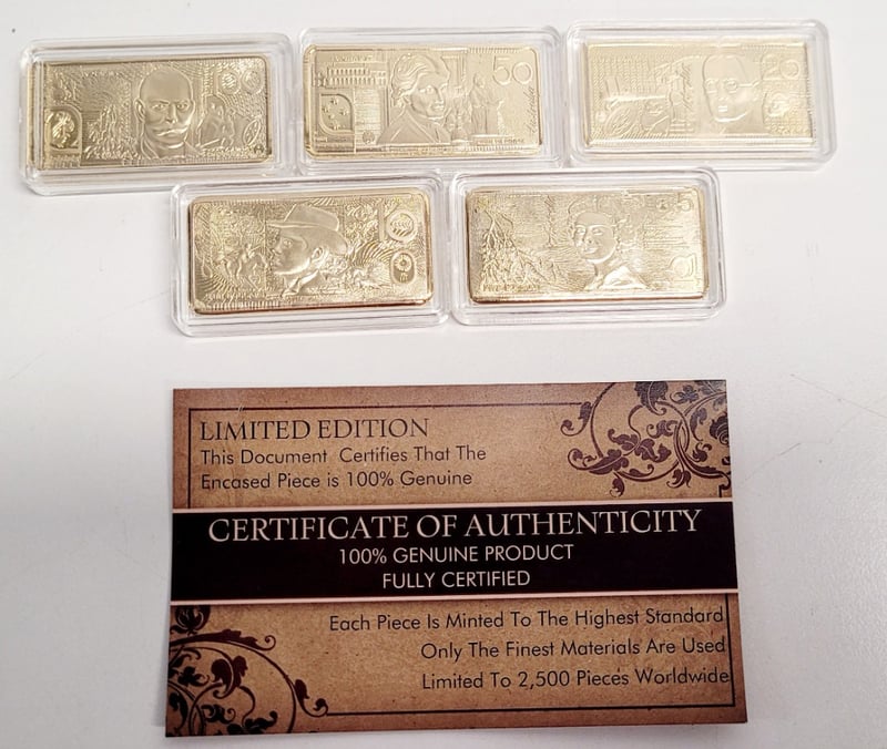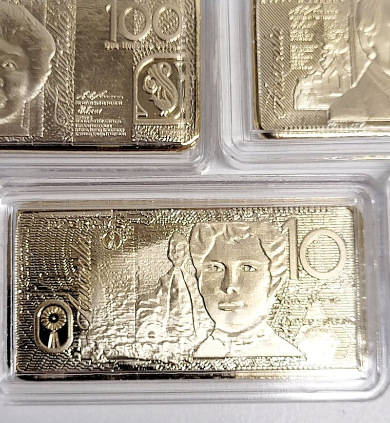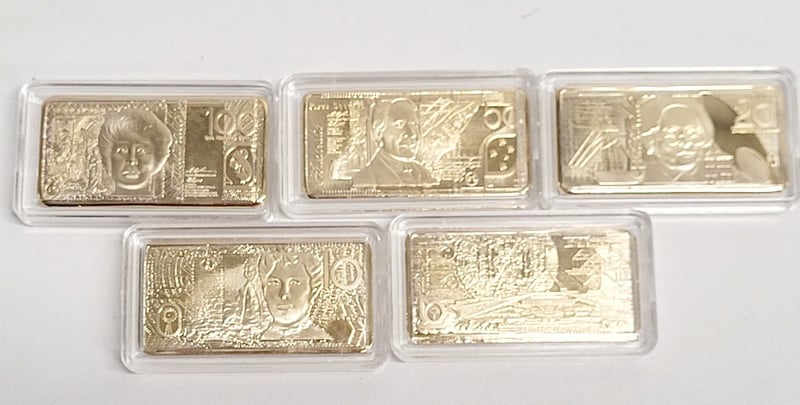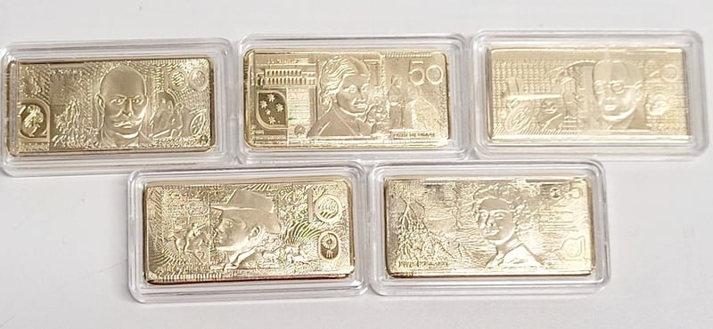 CERTIFIED SET OF 5 X 10 GRAM ``POLYMER NOTE SERIES`` FINISHED IN 999 24K GOLD PLATED