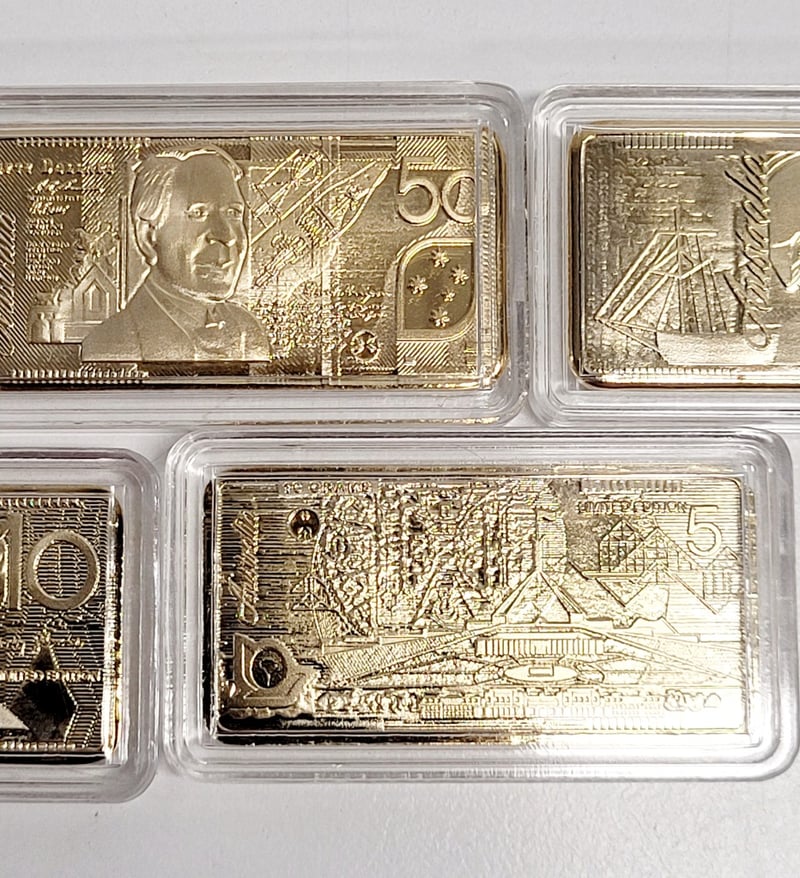 COMPLETE NEW SET OF 5 2014 5 GRAM ``AUSTRALIAN POLYMER NEW NOTE SERIES`` FINISHED IN 999 24 K GOLD