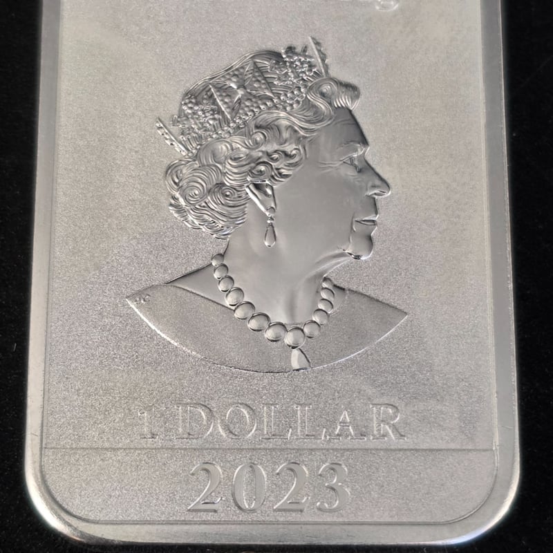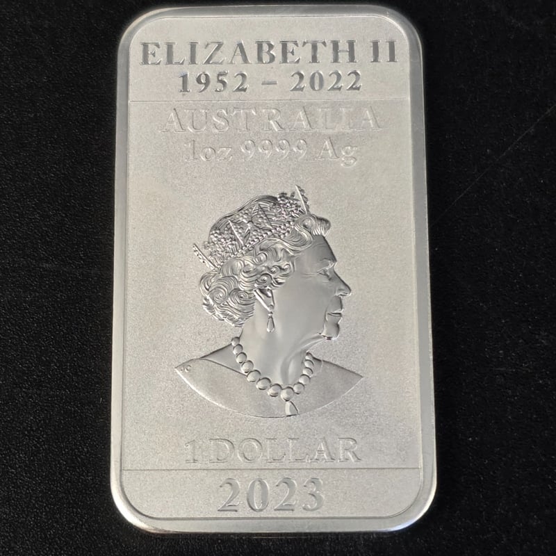 AUSTRALIA 1 DOLLAR SILVER COMMEMORATIVE BAR 2023 - ELIZABETH II MEMORIAL (1952-2022)This Exceptional Commemorative Silver Bar Honours Queen Elizabeth Ii'S Reign From 1952 To 2022. Minted In 2023 By The Perth Mint, It Features 1 Ounce Of .9999 Pure Silver In An Ingot Format. The Obverse Displays An Elegant Profile Portrait Of Her Majesty Wearing Her Crown And Pearl Necklace, Surrounded By Inscriptions "Elizabeth Ii 1952-2022" And "Australia 1Oz 9999 Ag". The Reverse Showcases An Intricate Mythological Dragon Design In Relief, Demonstrating Exceptional Artisanal Craftsmanship WitCondition: Proof232990+17