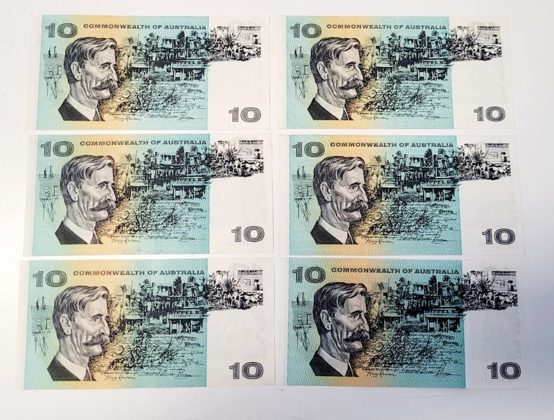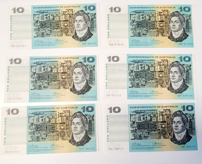 AUSTRALIAN $10 SIGNED BANKNOTE - TAT601281, SXG439960, SXE204325, TAA915568, SUP890158, SVL388131