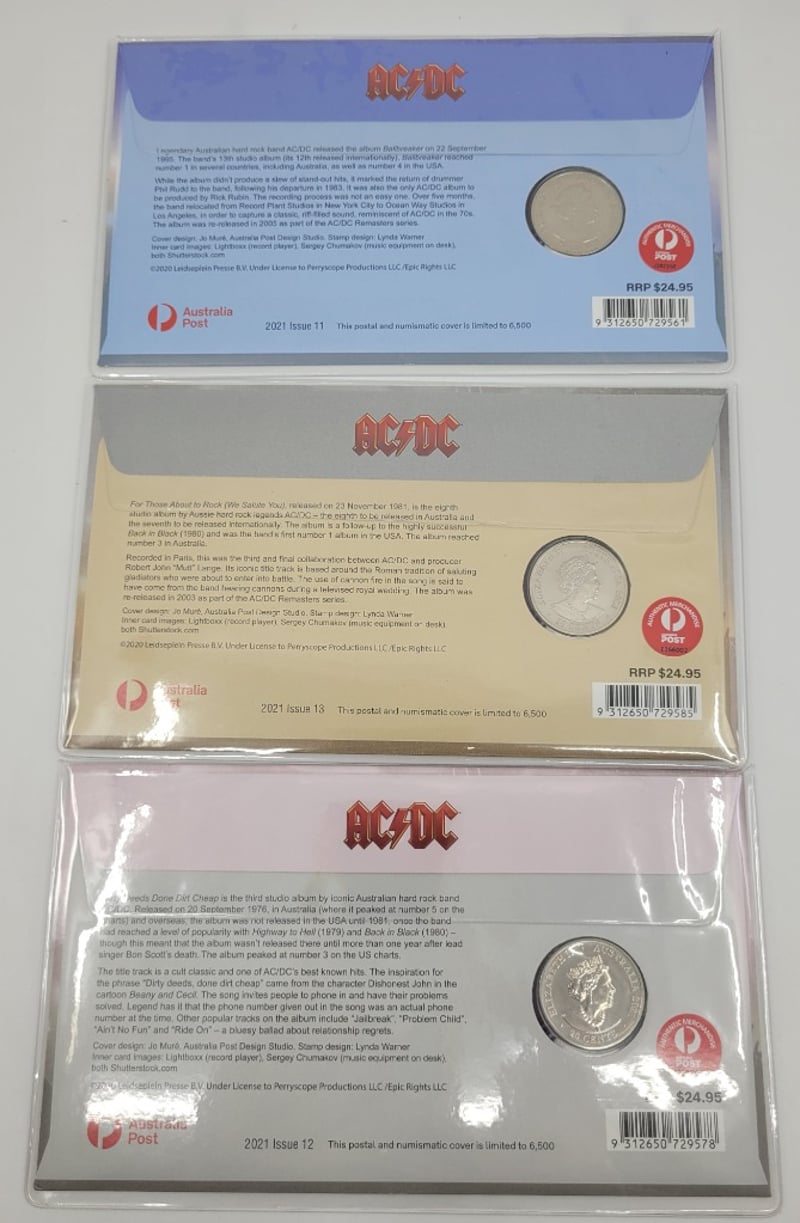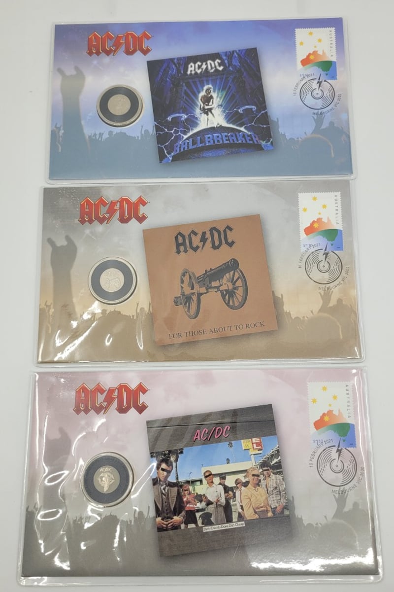 COLLECTION OF AC/DC COINS AND COVER STAMPSCoins Include:2021 Issue 12 Dirty Deeds Done Dirt Cheap, 2021 Issue 13 For Those About To Rock, 2021 Issue 11 Ball Breaker587920+6