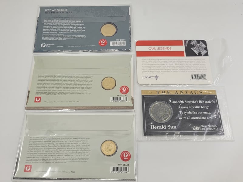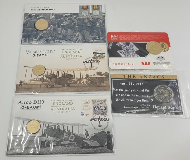 Gold 25C 100 Years Of Anzac, The Anzacs Herald Sun, $1 Lest We Forget The Vietnam War, $1 Vickers "Vimy" G-Eaou, $1 Airco Dh9 G-Eaqm