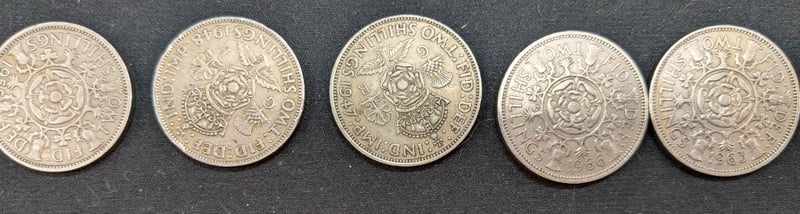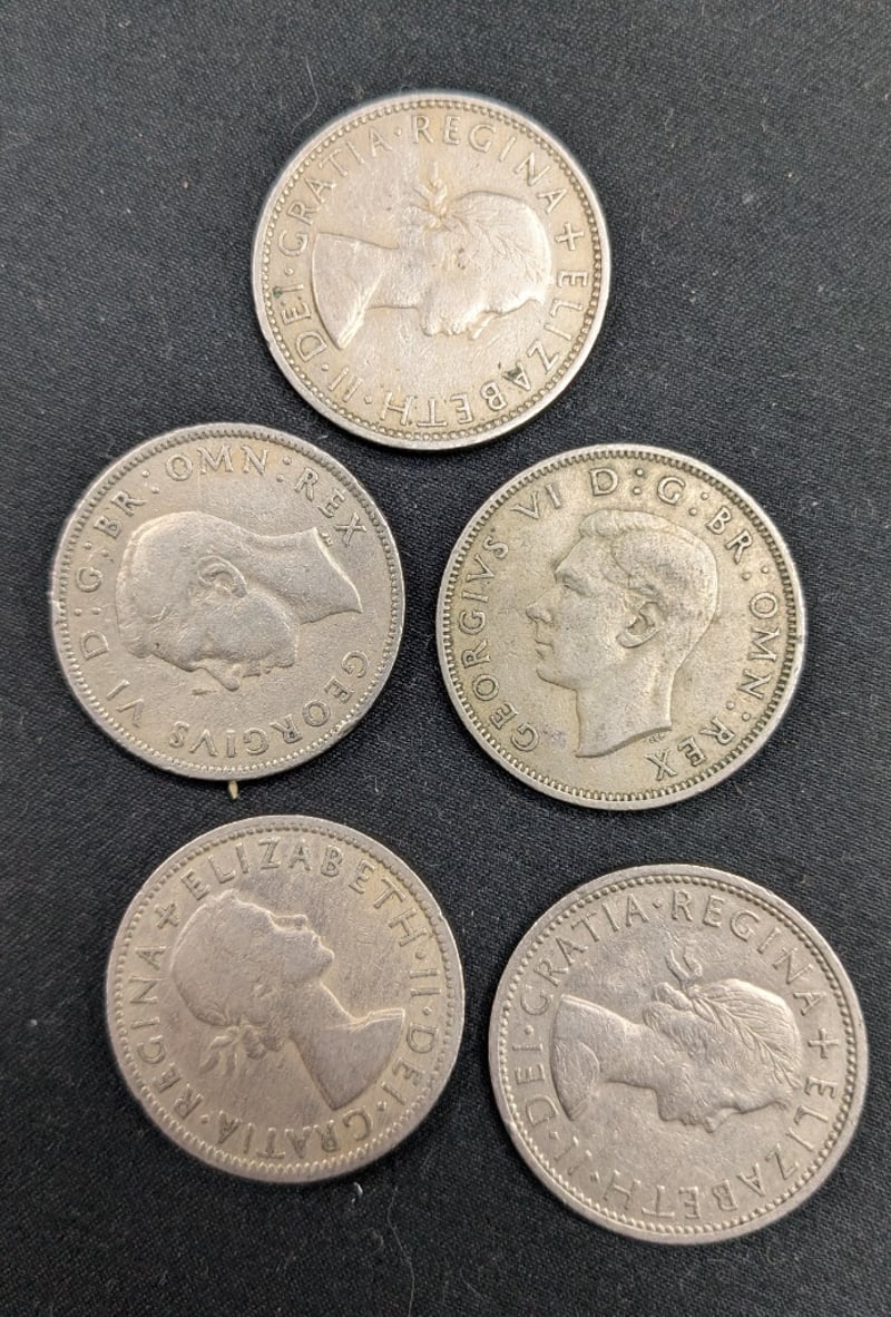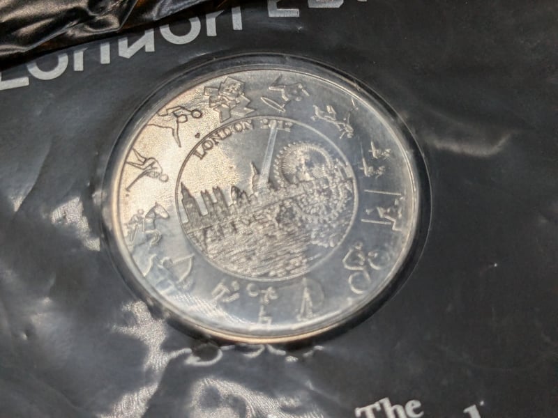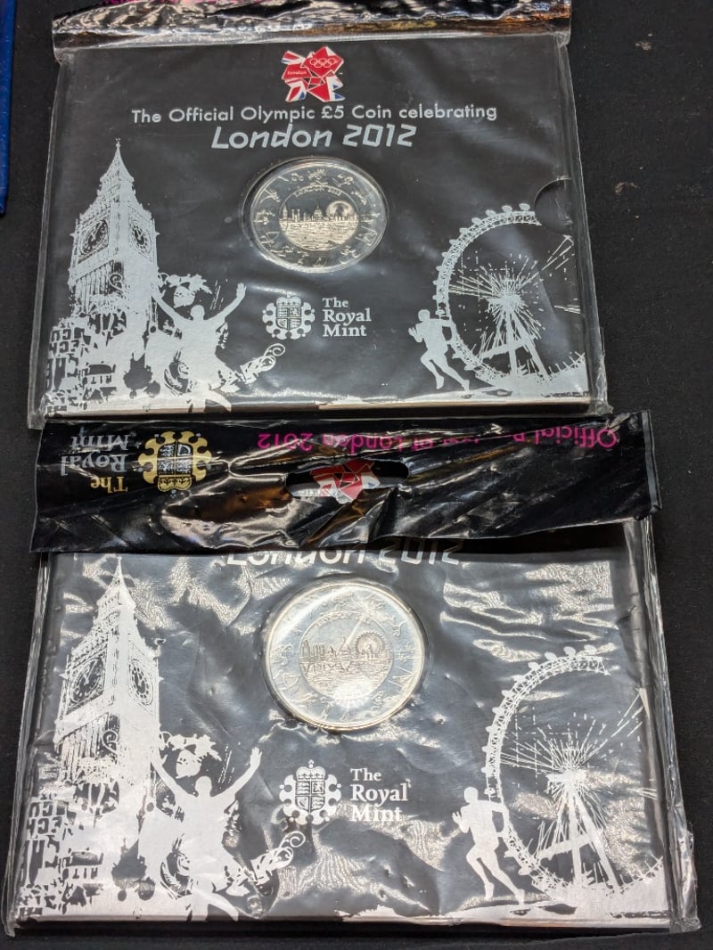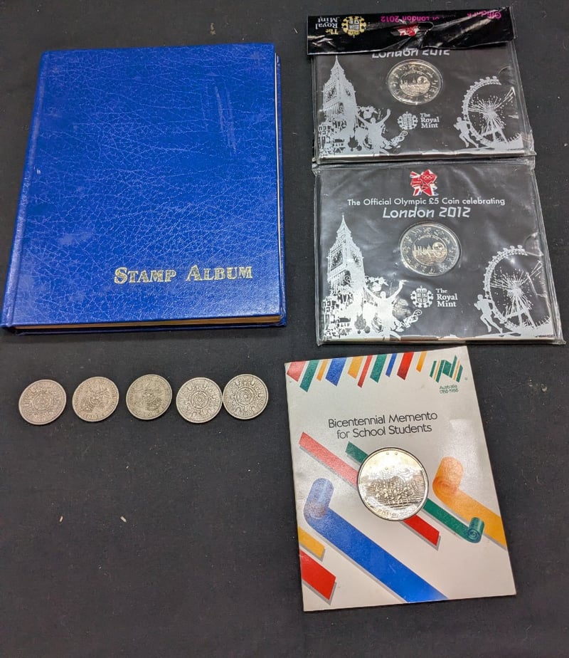 Includes Stamp Album, Two Royal Mint 2012 London Olympic Five Pound Coin, Bicentennial Memento For School Students, And 1947, 1948, 1955, 1963 And 1966 Two Shillings Coin