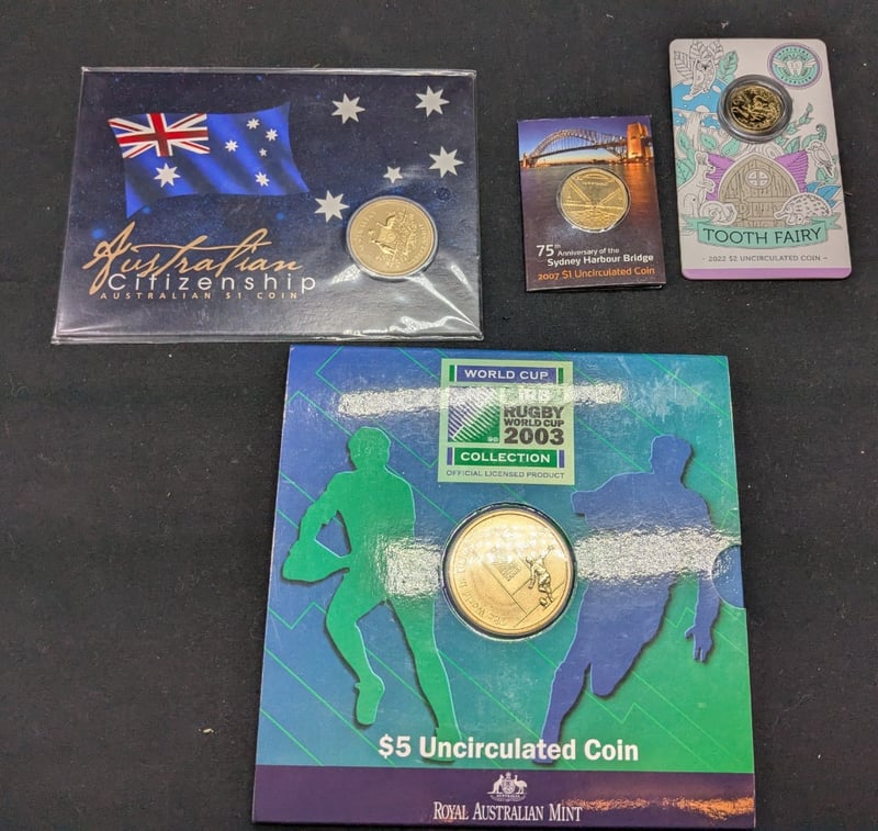 Includes 2003 Royal Australian Mint Rugby World Cup Unc Five Dollar Gold Coin, 2007 Australian Unc One Dollar Sydney Harbour Bridge Gold Coin, 2022 Australian Unc Two Dollar Tooth Fairy Gold Coin