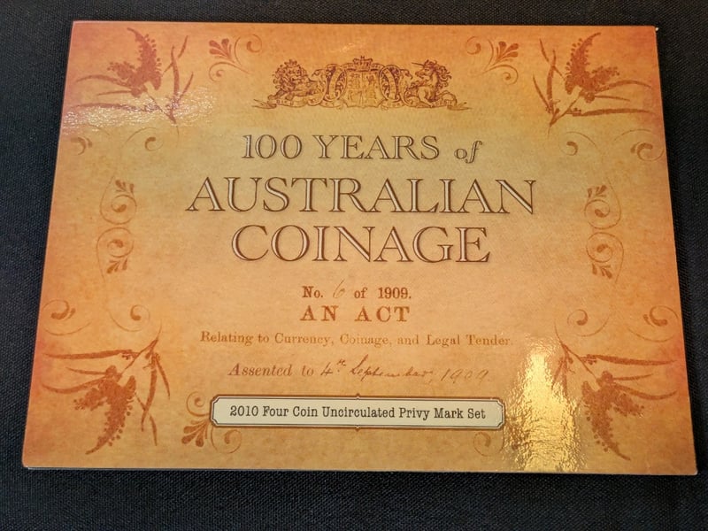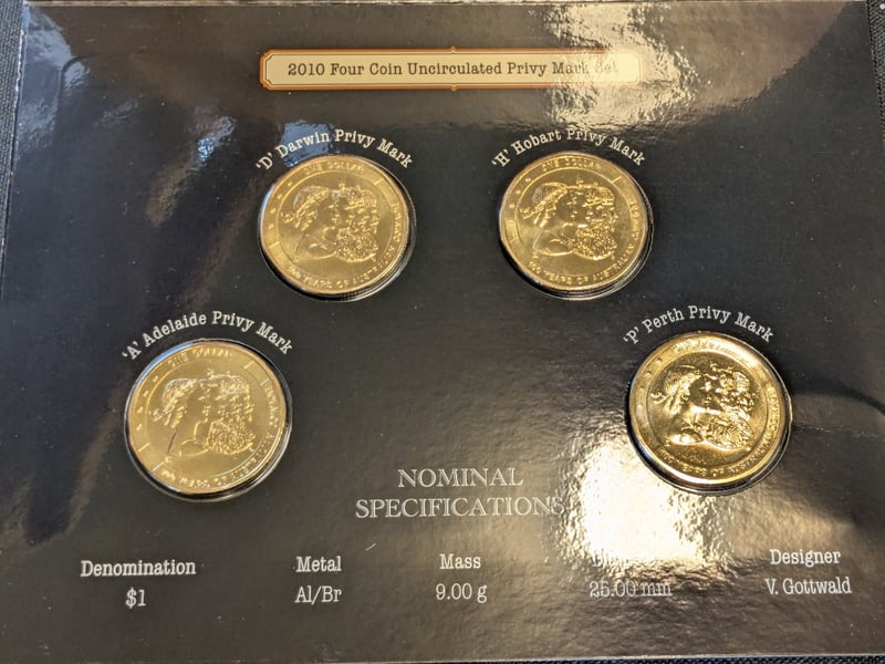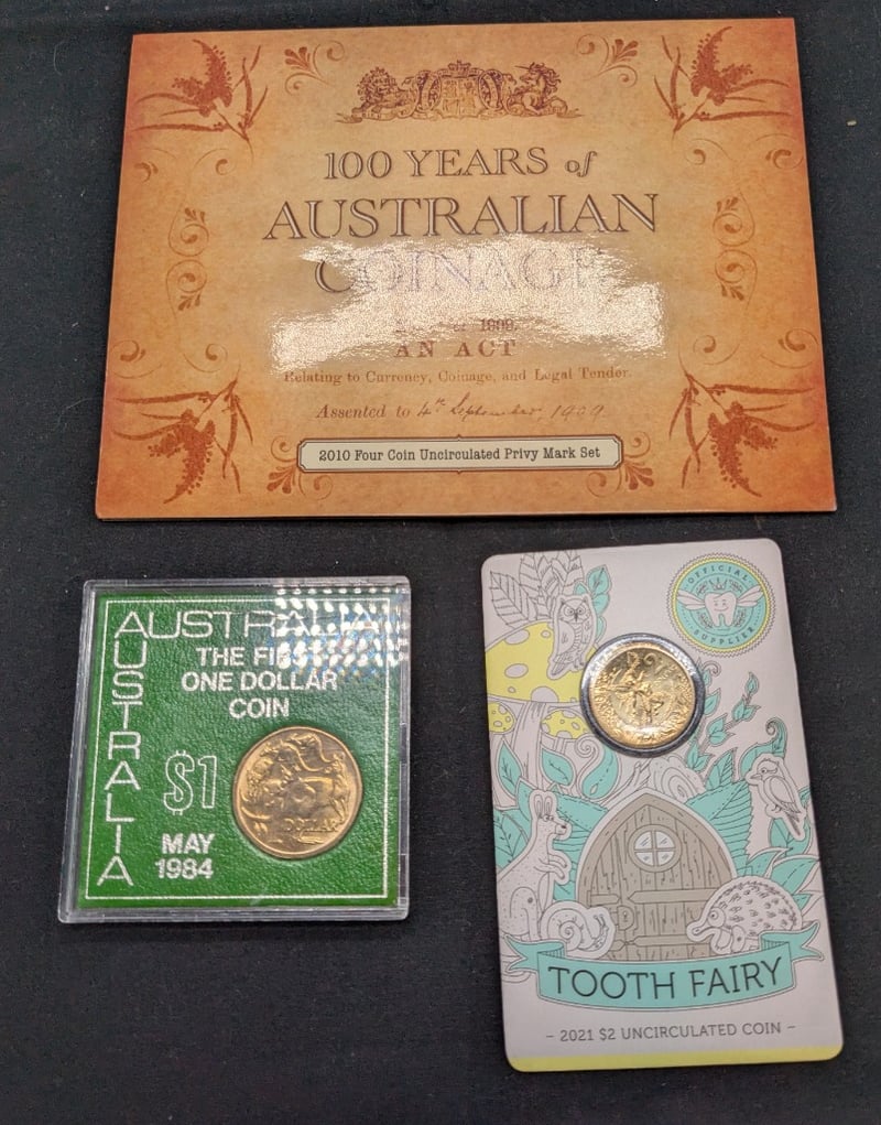 Includes 1984 Australian One Dollar Gold Coin: Australian First One Dollar Coin, 2010 Royal Australian Mint Four Coin Uncirculated Privy Mark Set, 2021 Australian Two Dollar Unc Two Dollar Gold Coin: Tooth Fairy