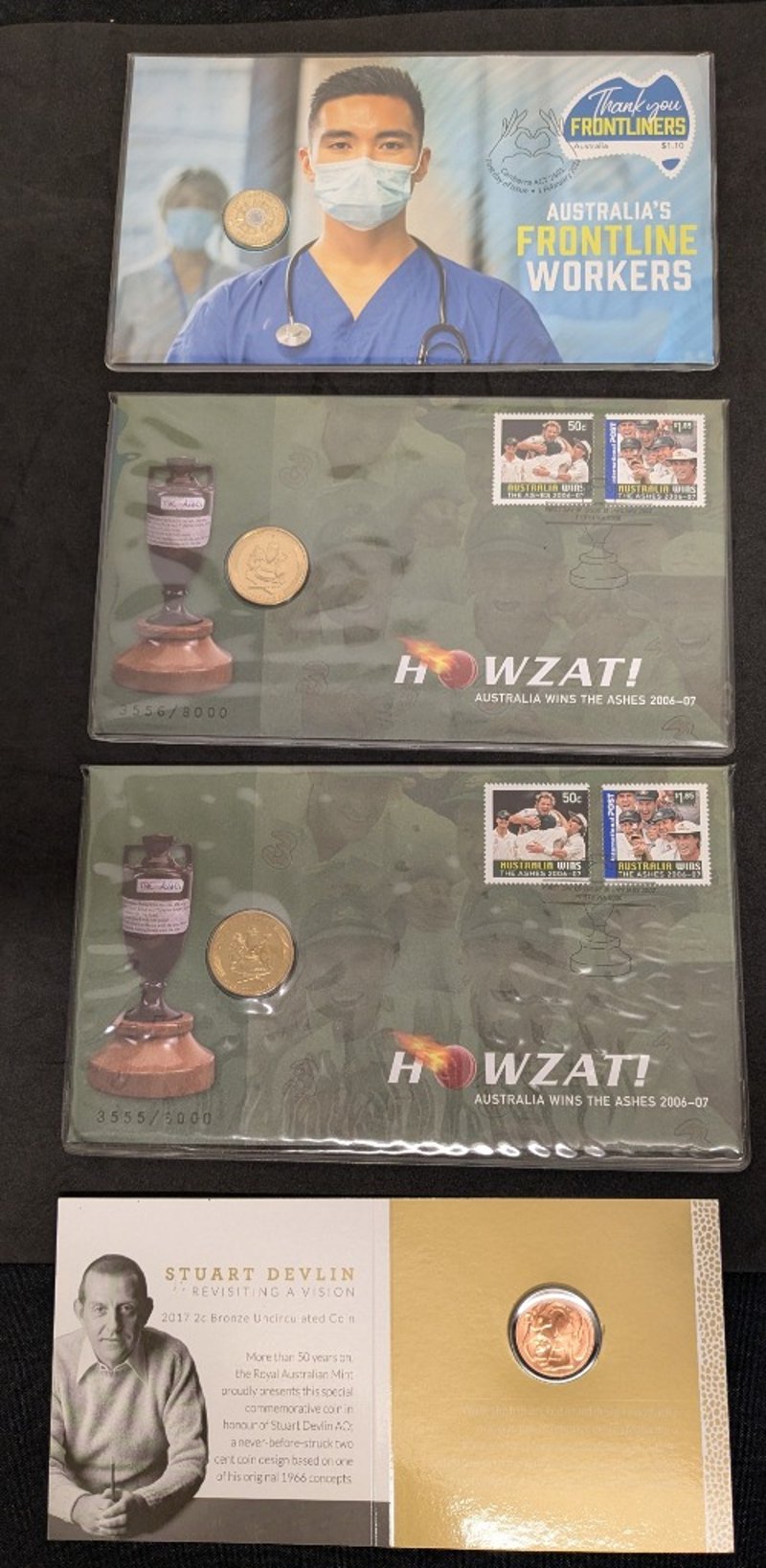 Includes 2017 Stuart Devlin 'Revisiting A Vision' Two Cent Bronze Uncirculated Coin, Two Limited Edition 2007 'Howzat!' Australia Wins The Ashes One Dollar Coin, 2022 Australia'S Frontline Workers Two Dollar Coin
