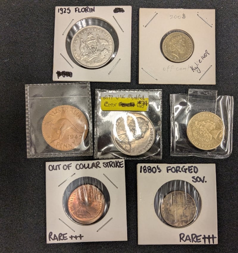 Includes 1978 Australian Two Cent Out Of Collar Strike Error Coin, 1880S Forged Sovereign Coin, 1942 Australian Penny, Etc