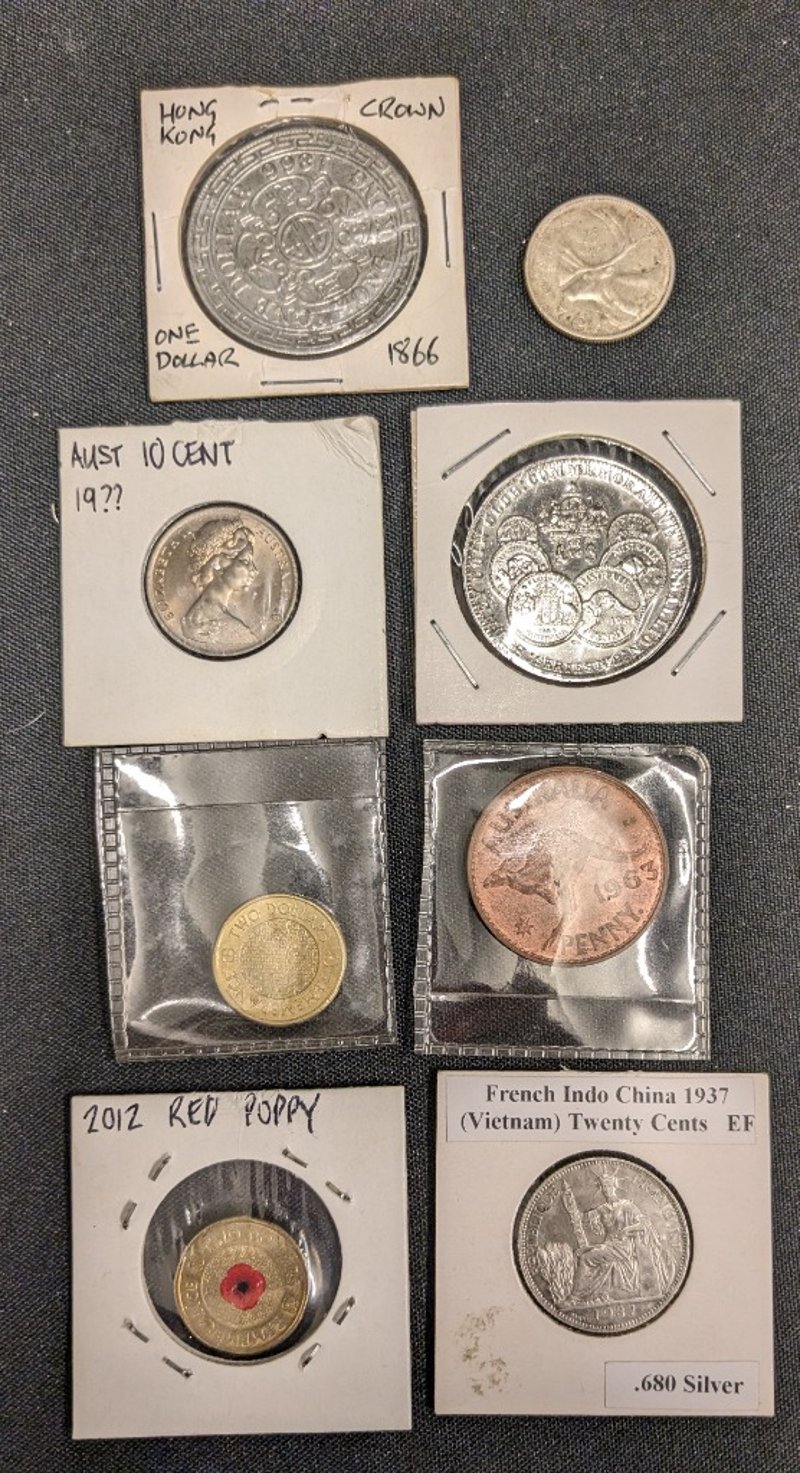 MIXED INTERNATIONAL COIN COLLECTION INCLUDING HONG KONG CROWN 1866, AUSTRALIAN PENNIES, BRITISH COINS, AND ERROR ISSUES 584521+18