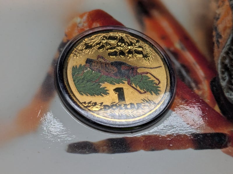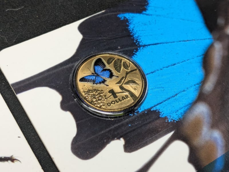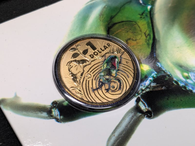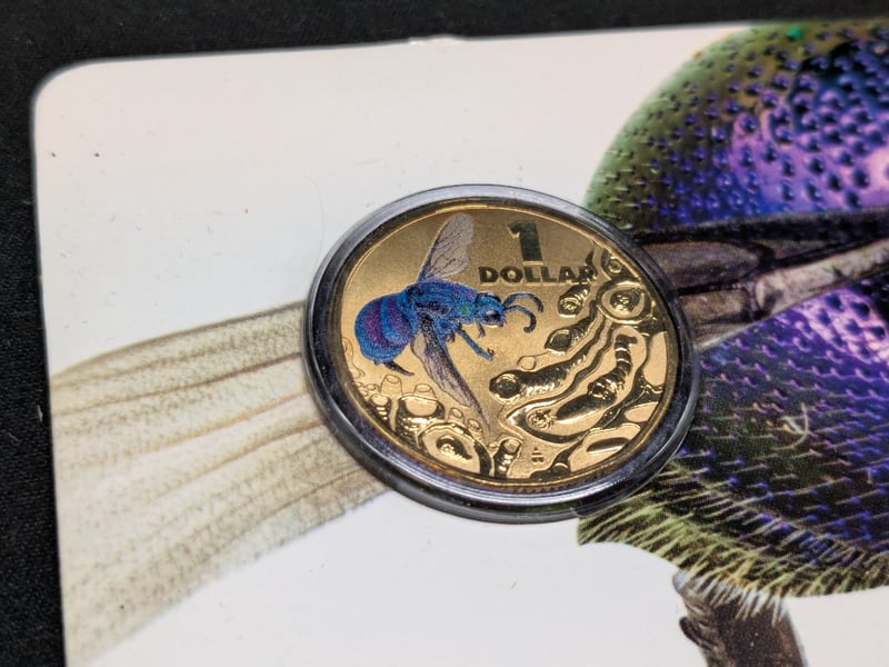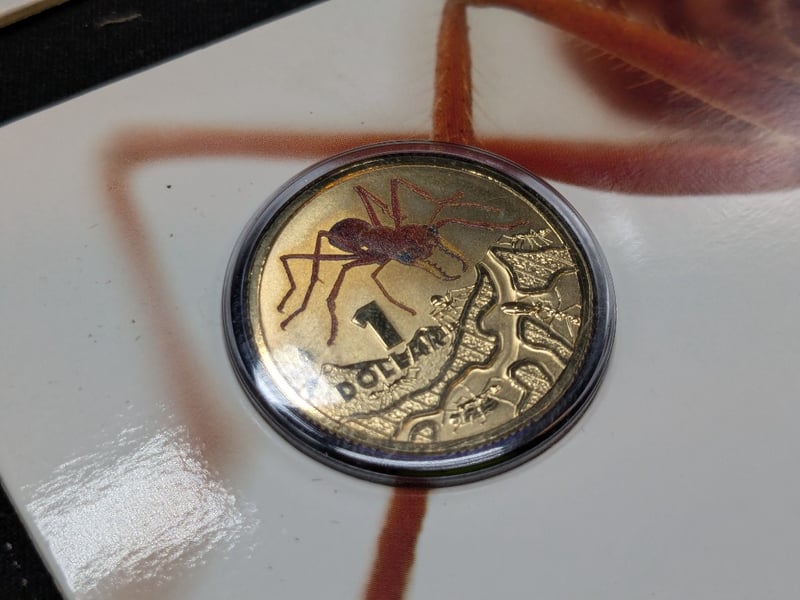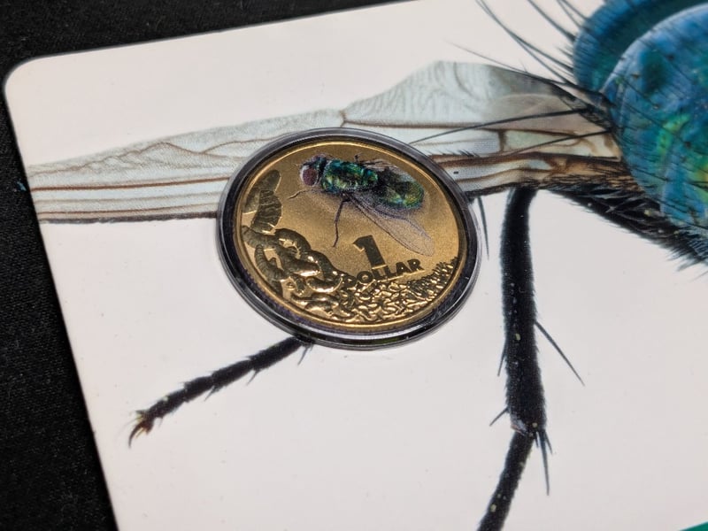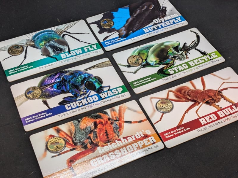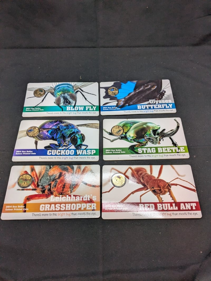 2014 ONE DOLLAR COLOURED PRINTED COIN SET - INSECTS SERIES (BLOW FLY, ULYSSES BUTTERFLY, CUCKOO WASP, STAG BEETLE, GRASSHOPPER, RED BULL ANT)