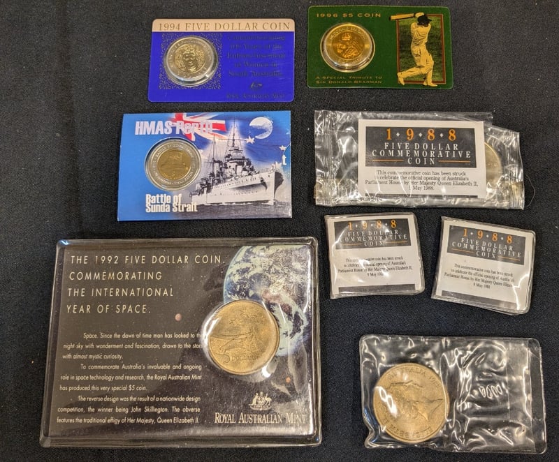 COLLECTION OF COMMEMORATIVE FIVE DOLLAR COINS Includes Five 1988 Commemorative Coins, 1992 Royal Australian Mint International Year Of Space Five Dollar, 1996 Donald Bradman Commemorative Five Dollar Coin, Etc 584448+29