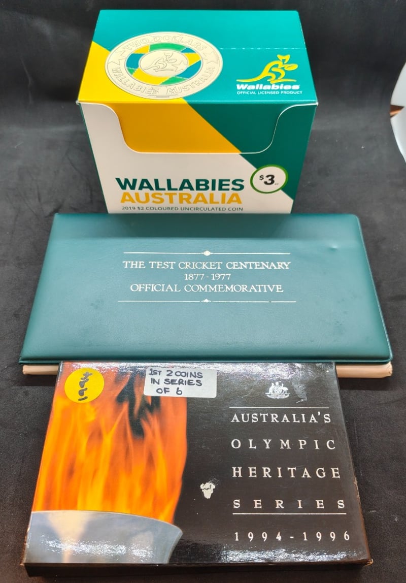 COLLECTION OF AUSTRALIAN ROYAL MINT SPORTING MEMORABILIA COIN SETS Condition: Aunc Provenance: Includes:- 2019 Wallabies Australia $2 Uncirculated Coin Sets- 1994-96 Australia'S Olympic Heritage Series (Incomplete)- 1977 Centenary Of Test Cricket ACACIA RIDGE 584448+32