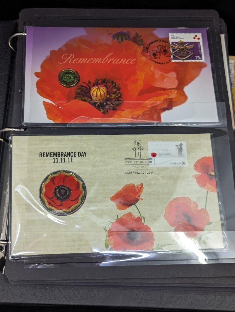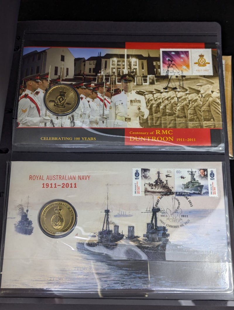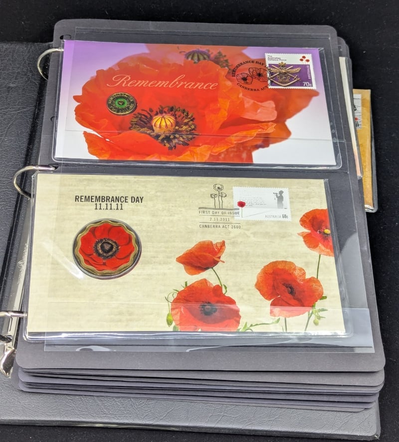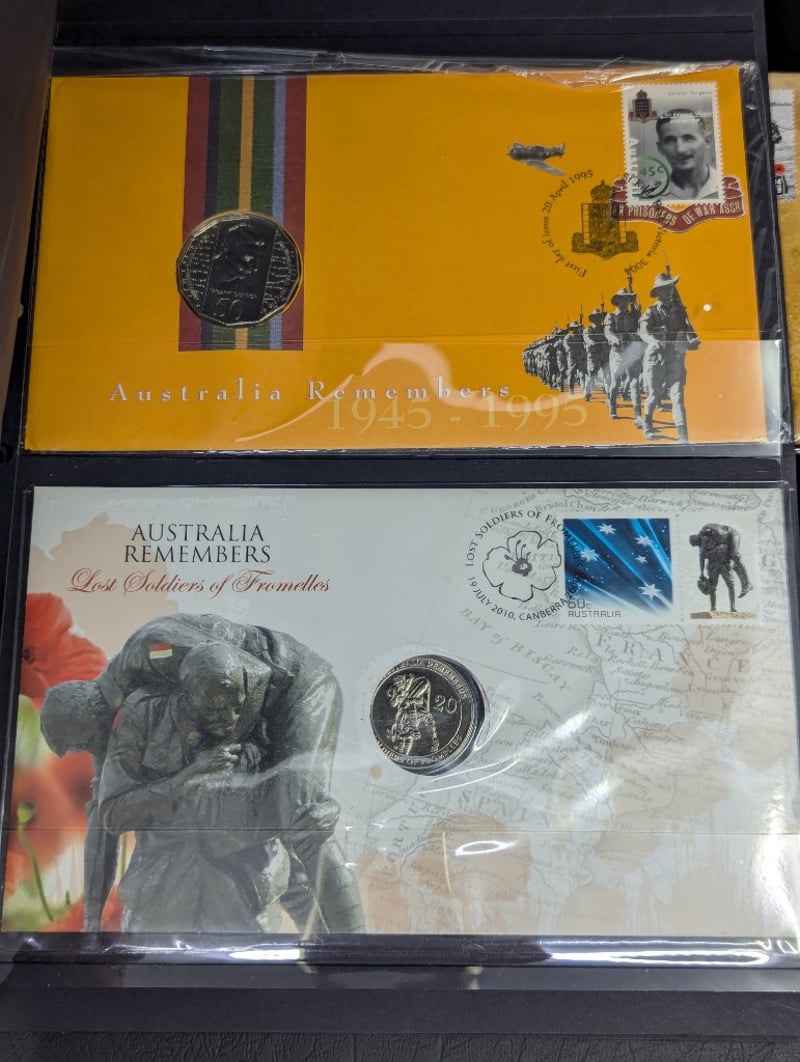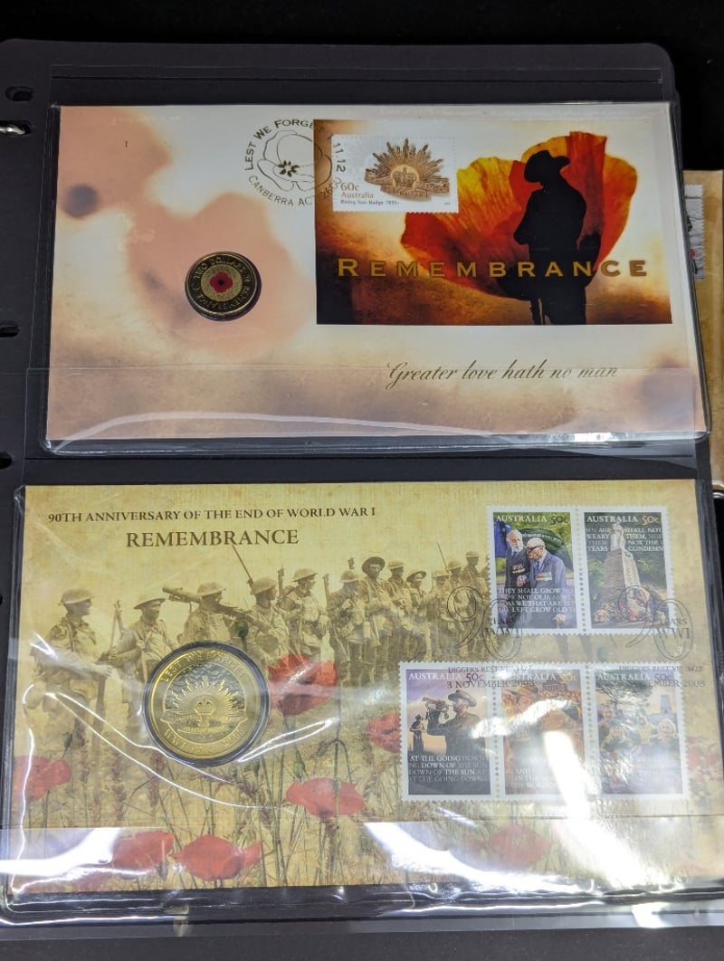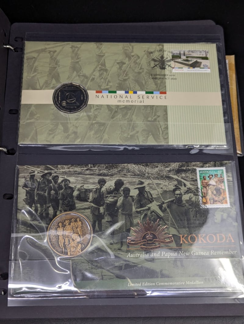 FOLDER WITH COLLECTION OF AUSTRALIAN AND WARTIME MEMORIAL COINS AND COVER STAMPS