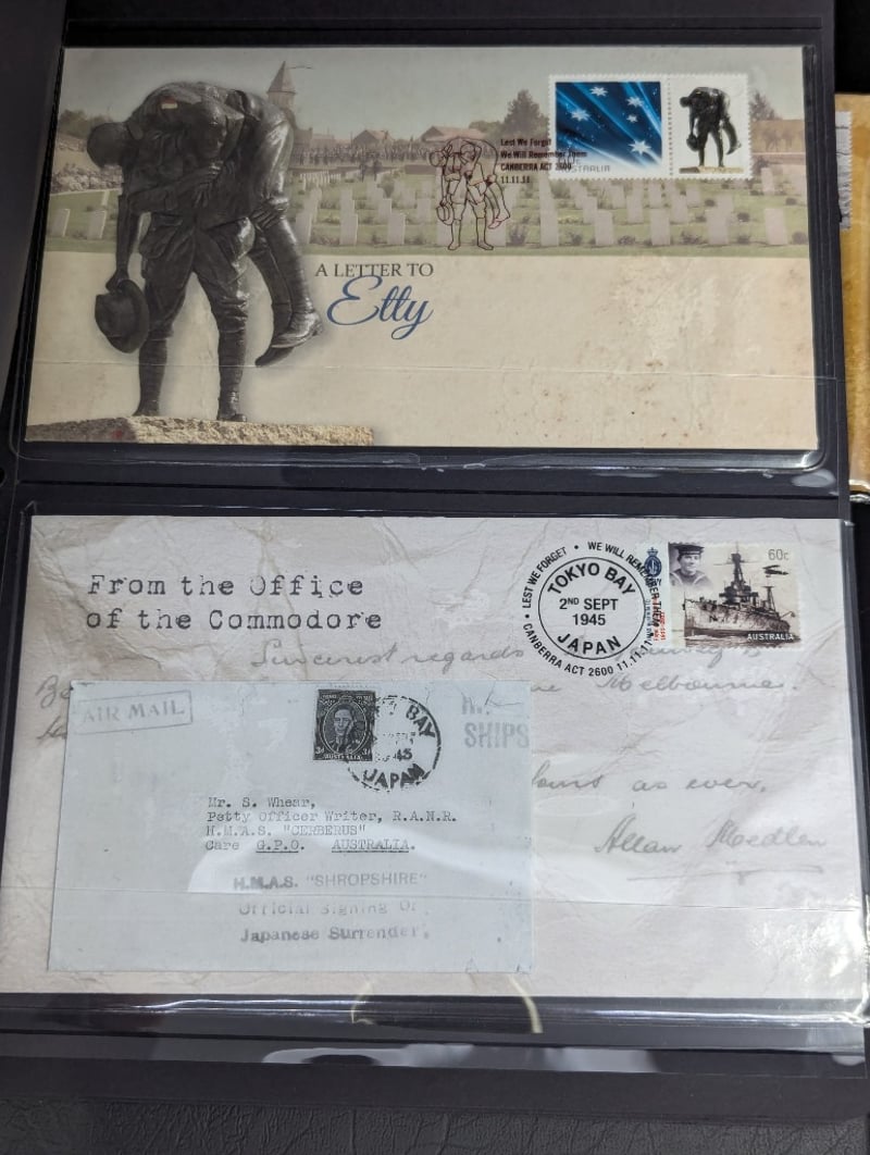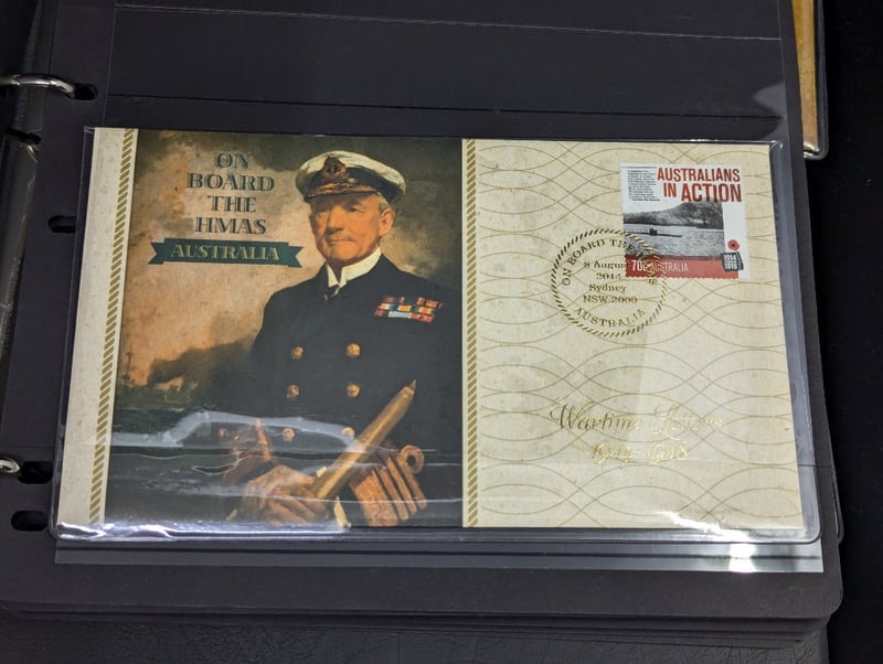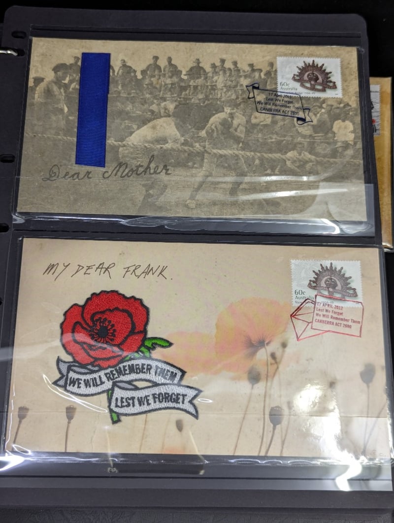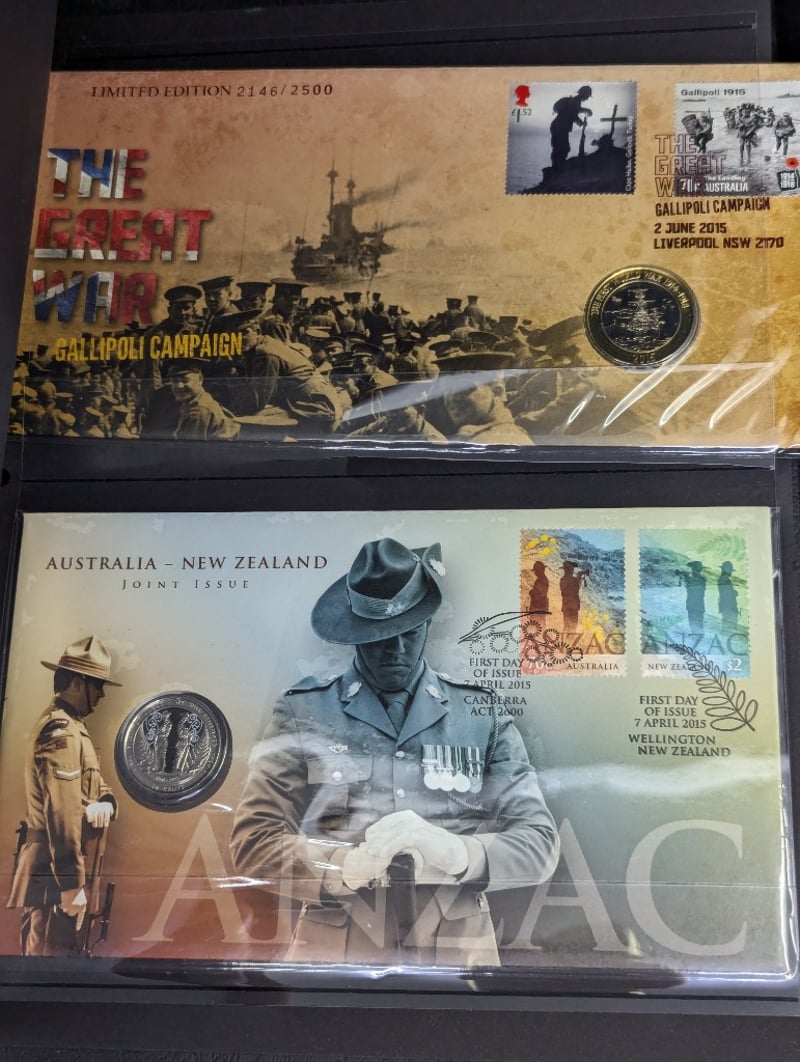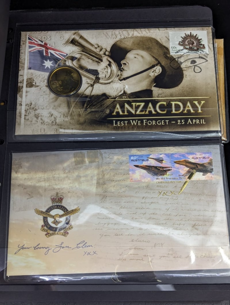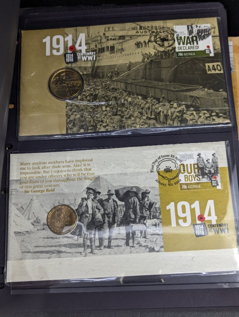 FOLDER WITH COLLECTION OF AUSTRALIAN AND WARTIME MEMORIAL COINS AND COVER STAMPS