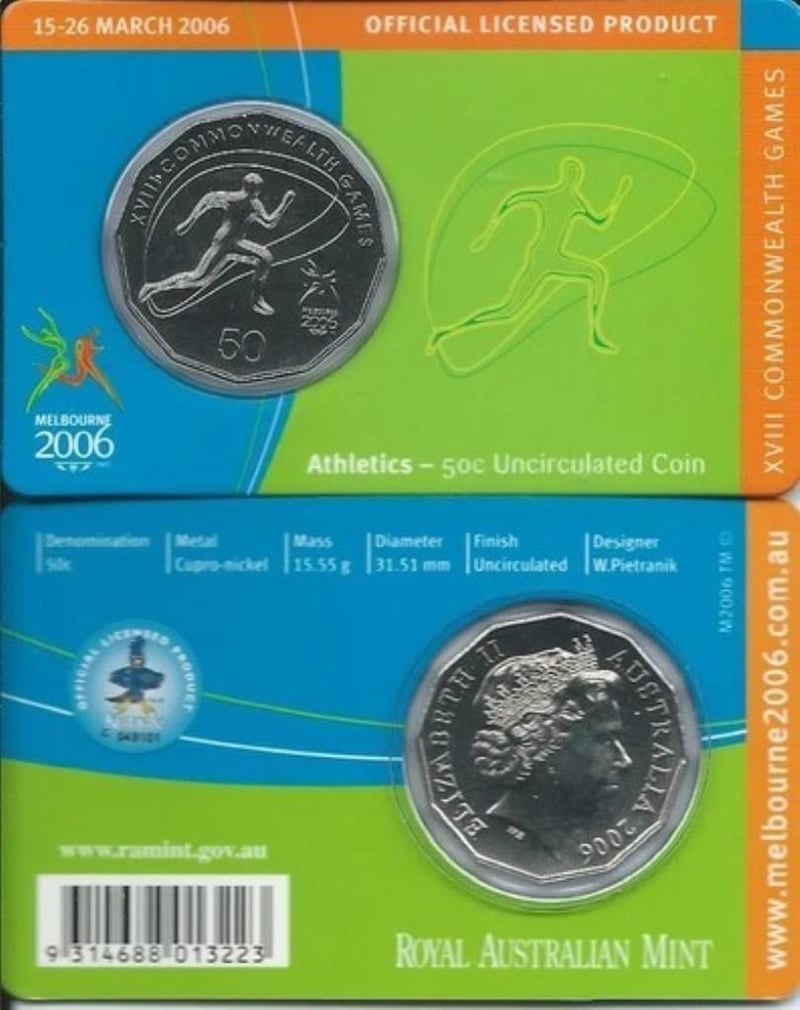 2006 50 CENT MELBOURNE COMMONWEALTH GAMES IN CARD "ATHLETICS" COIN:UNC 11602+5