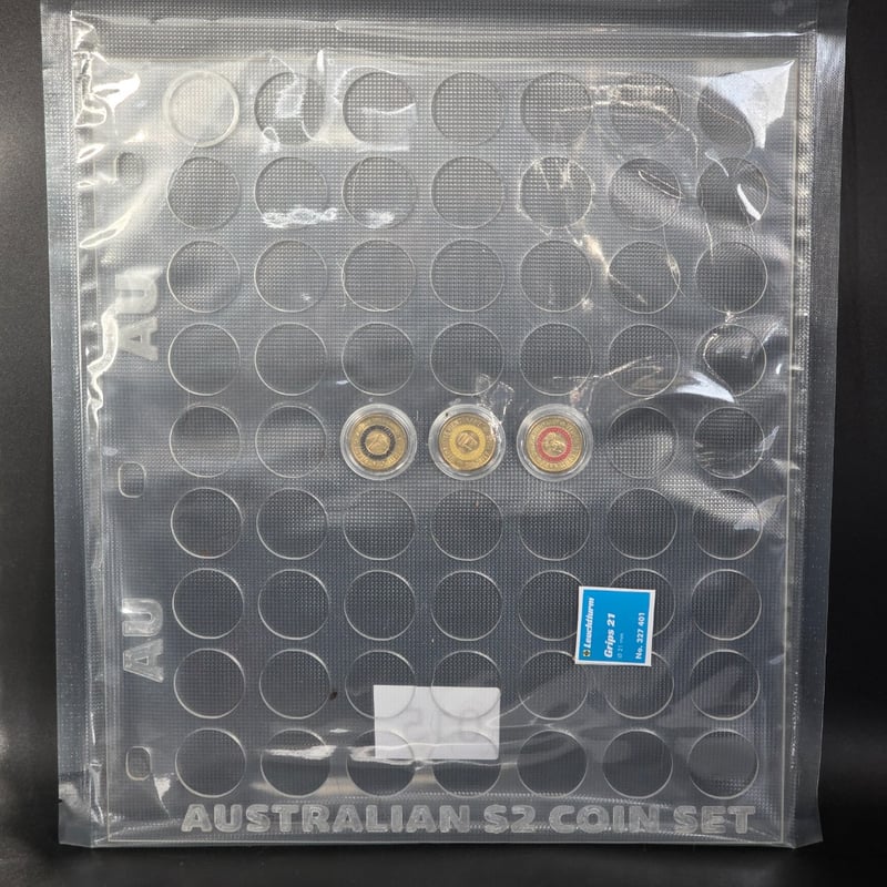 $2 COINS DISPLAY TRAY, 63 SLOTS, INCLUDING UNC VEGEMITE COIN SET, HOLE SIZE 21MM FOR COIN CAPSULES, SUITED FOR GRIPS 21 LEUCHITTURN BRAND COIN CAPSULES