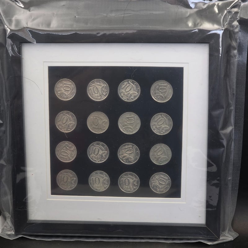 10C CUD ERROR COINS, INCLUDES 16 COINS IN CUSTOM FRAME 231808+43
