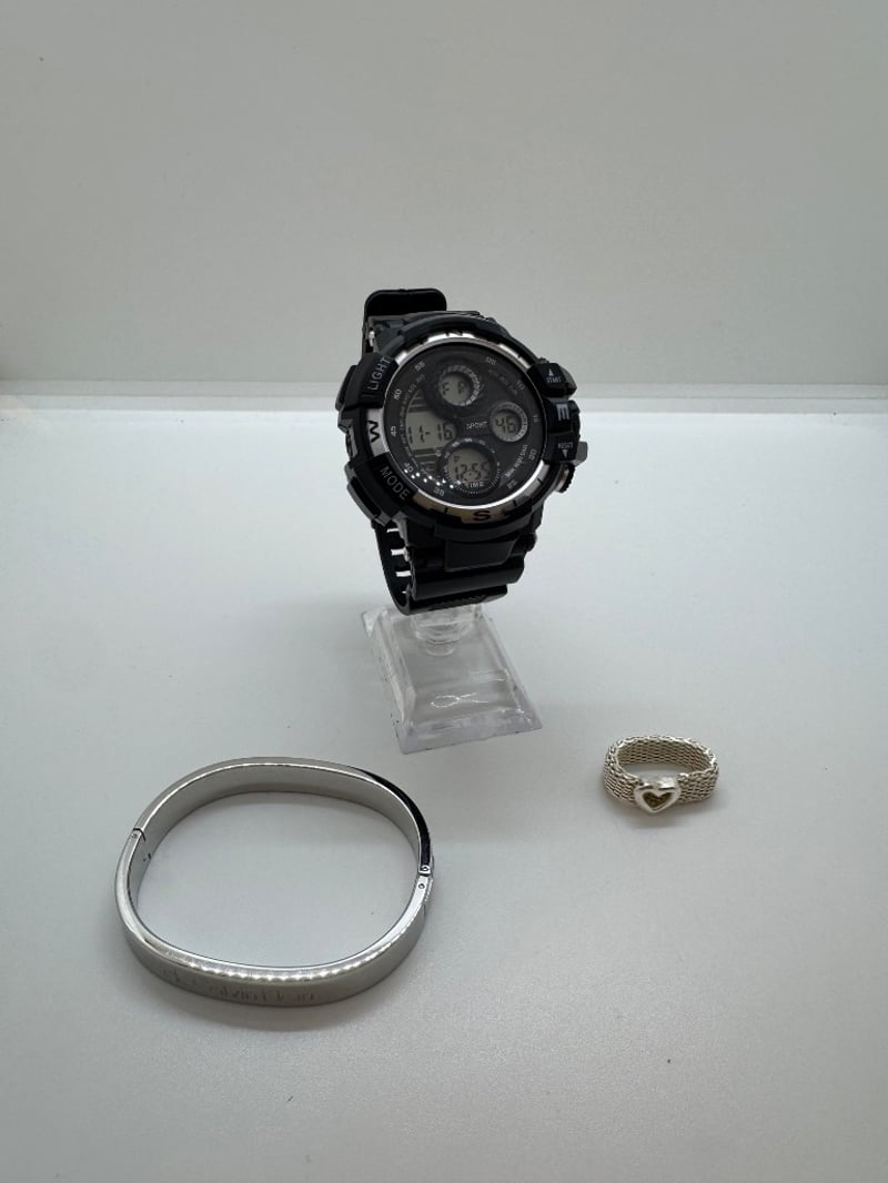 CHRONOGRAPH SPORTS WATCH, CALVIN KLEIN KINGED SILVER COLUR BANGLE, TIFFANY & CO STERLING SILVER STAMPED 925 MESH