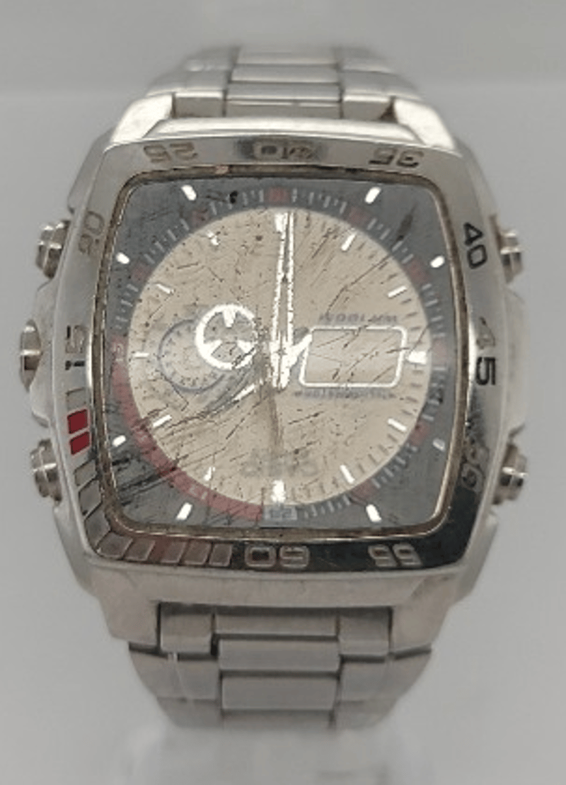 VASIO 4334EFA-122 S-1166DY 2006 REFERENCE NO. S-1166DYPRODUCTION YEAR: 2006DIAL: ANALOG - DIGITALCASE DESCRIPTION: SQUARE, STAINLESS STEEL CASE, WATER RESISTANTCASE SIZE: 44.9MMD×40MMW×11CMHBRACELET: STANLESS STEEL LINKSMOVEMENT: JAPANESE QUARTS MOVT DVBOX: NOT INCLUDEDPAPERS: NOT INCLUDEDCondition: Poor - Refer To ImagesTOORMINA548651+2