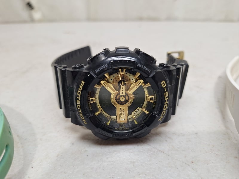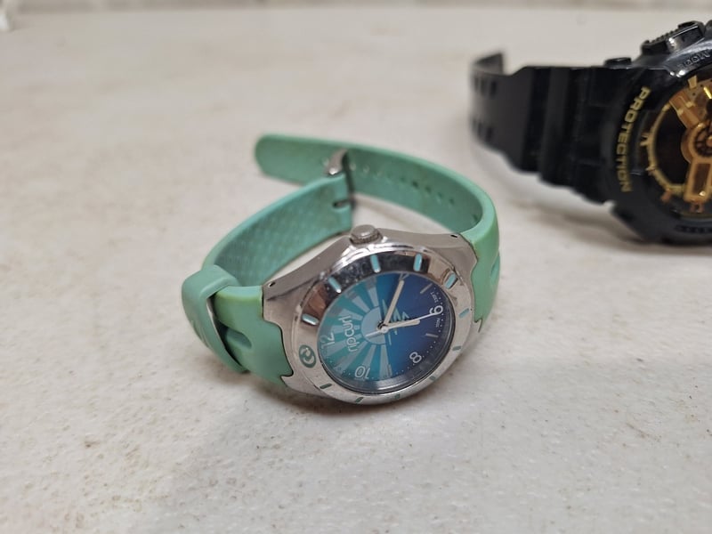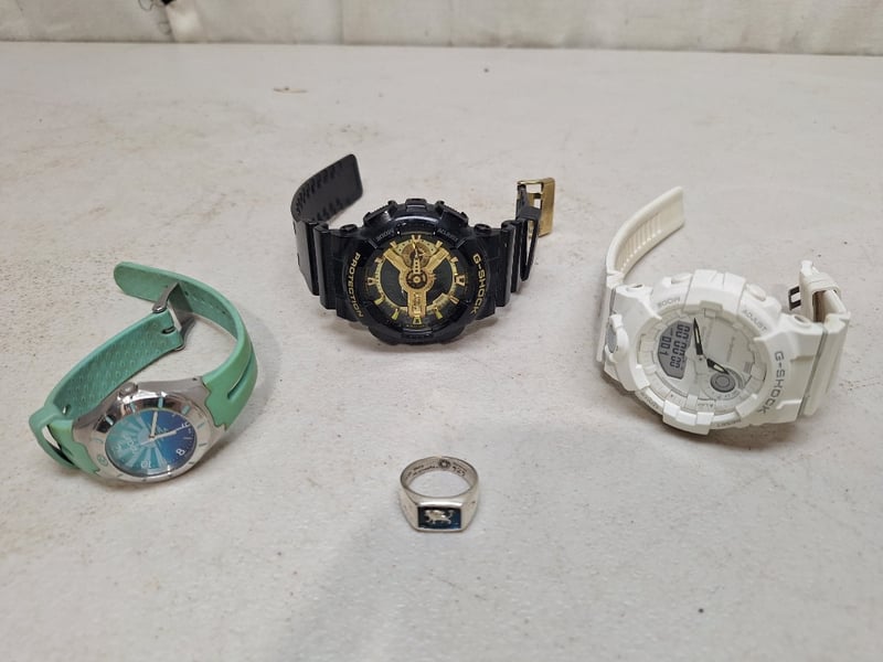 1x G-SHOCK casio men's watch, with step tracker and bluetooth system, 80B7LM, 1x G-SHOCK casio men's watch, WR20BAR, protection, 1x RIPCURL women's watch with rubber band, A21506, ARUBA model, 1x recycled sterling 925 silver ring, P-size, dragon design
