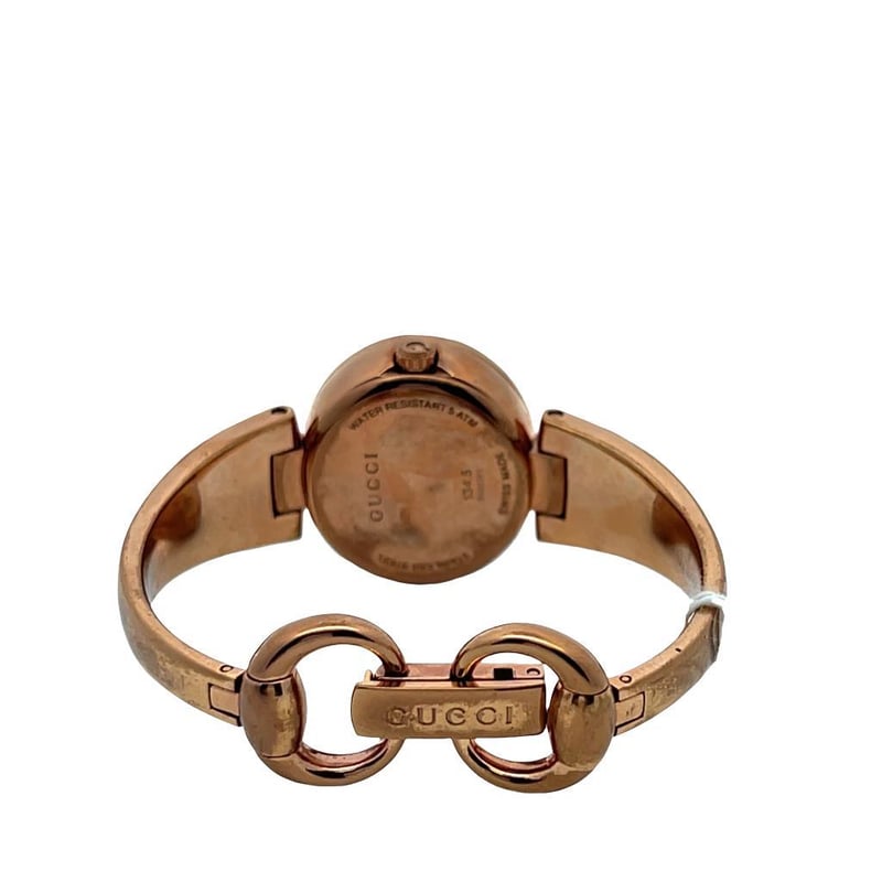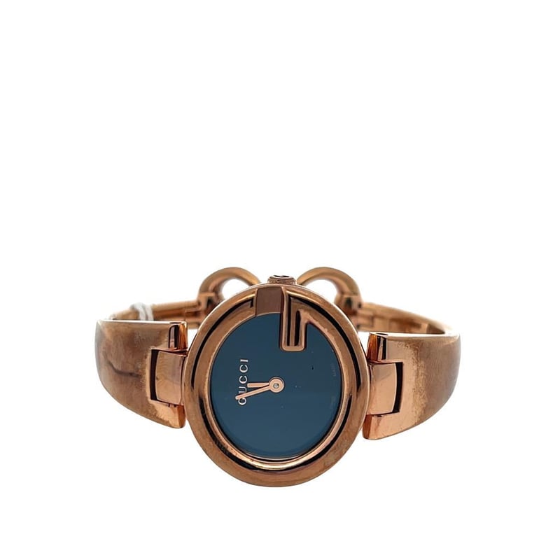 Model 134.5, Case Measures Approx. 26Mm, Rose Gold-Tone Stainless Steel Case With Signature Horsebit Bracelet Design, Black Dial With Minimalist Two-Hand Display, Swiss Made Quartz Movement, Integrated Rigid Bangle Bracelet With Hinge Closure. Condition: Pre-Owned With Visible Scratches And Plating Wear Throughout Bracelet And Case, Signs Of Oxidation/Discolouration, Overall Fair Vintage Condition.