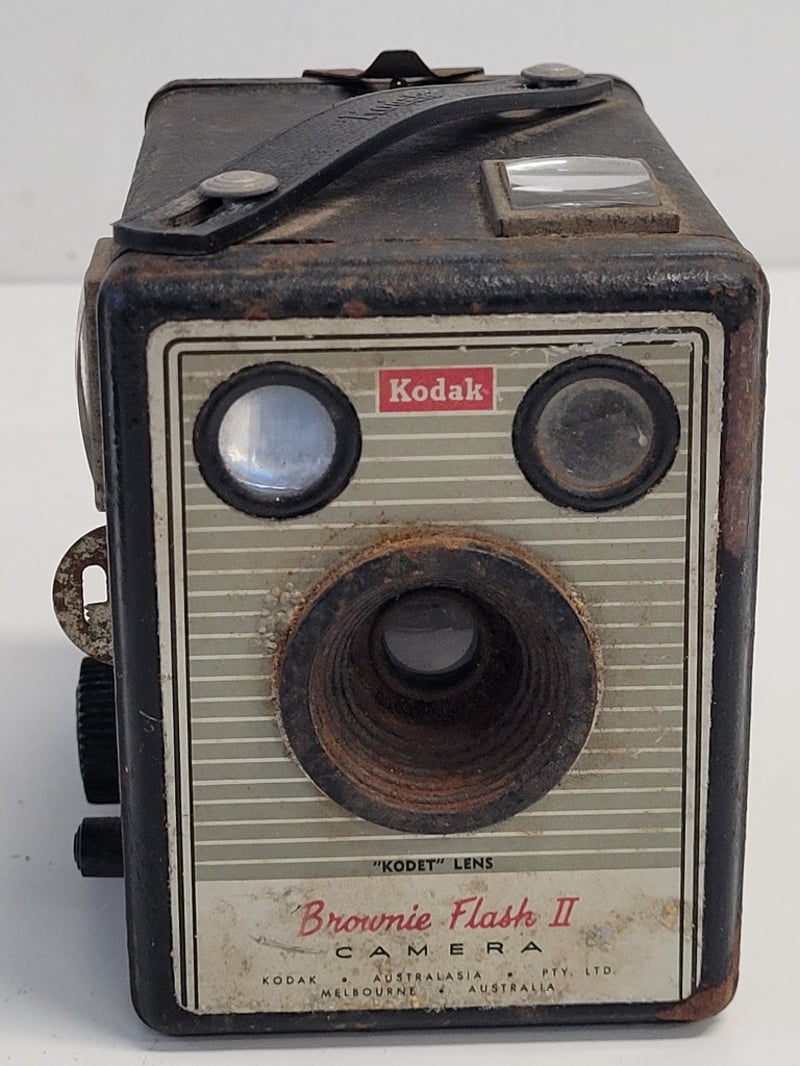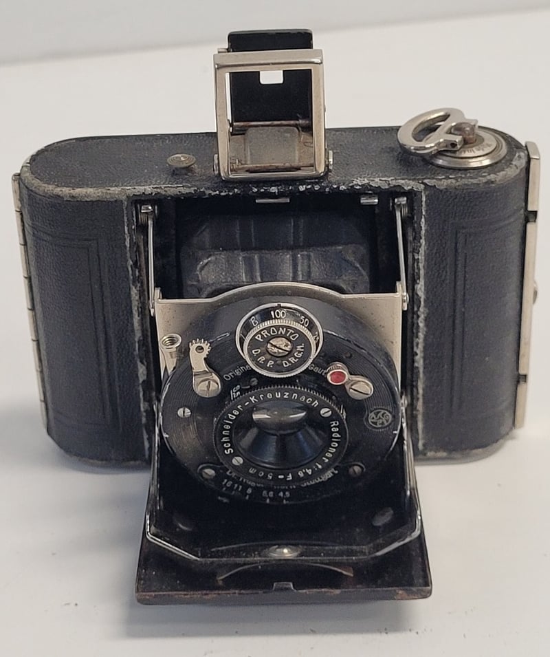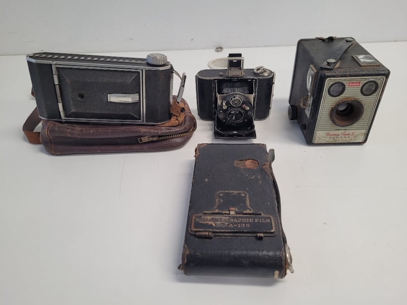 4 ANTIQUE CAMERASThese Antique Cameras Would Make A Unique, Attractive And Conversational Display. Brands Include Ponto, Kodak And Pontiac.1. Box Camera. Kodak-Brownie Flash 2. Still Has An Undeveloped Film In It.2. Ponto. Small Folding Pocket Camera.3. Eastman Kodak. Medium Size Folding Camera.4. Pontiac. Large Size Folding Camera.488543+14