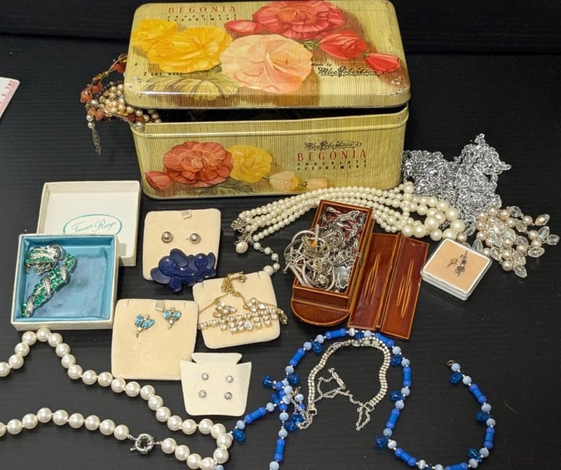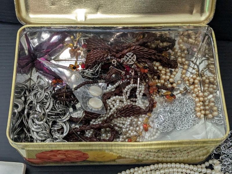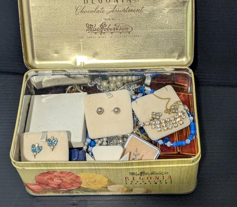 MACROBERTSONS BEGONIA VINTAGE TIN WITH VINTAGE & COSTUME JEWELLERYCondition: Good - Refer Images587853+5