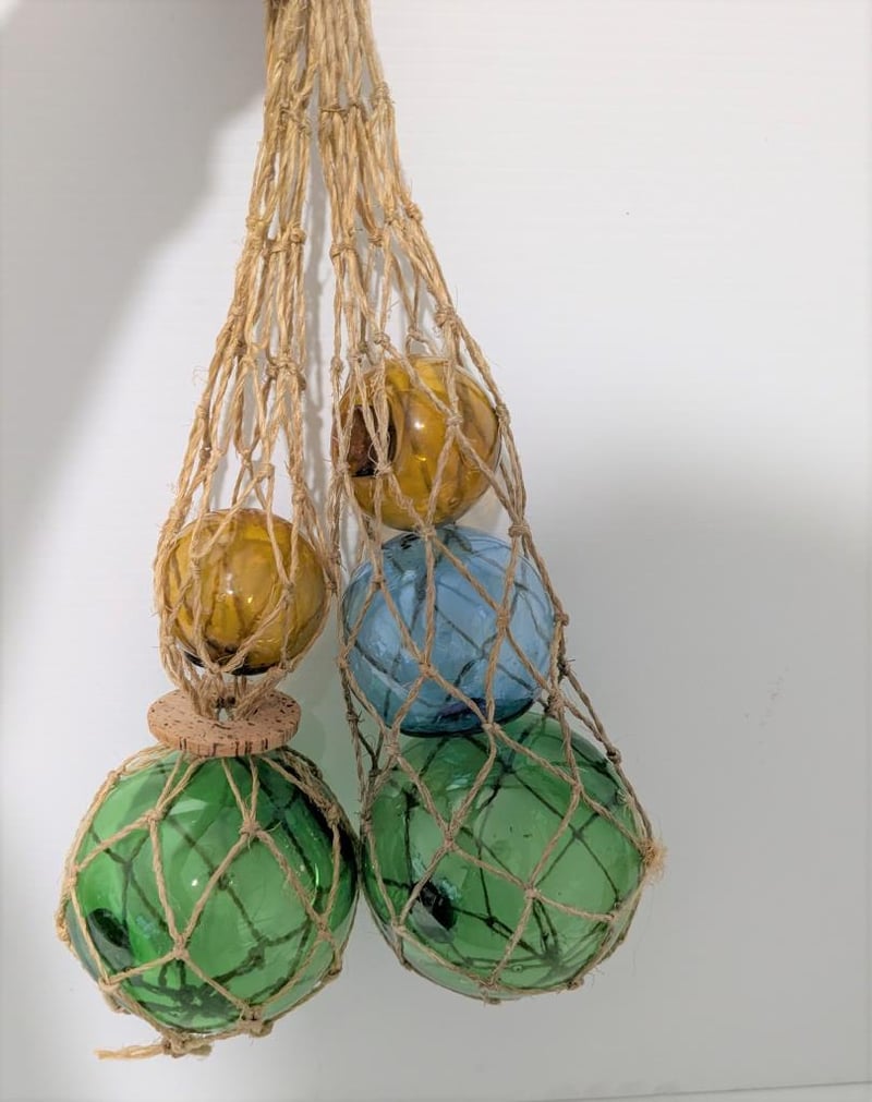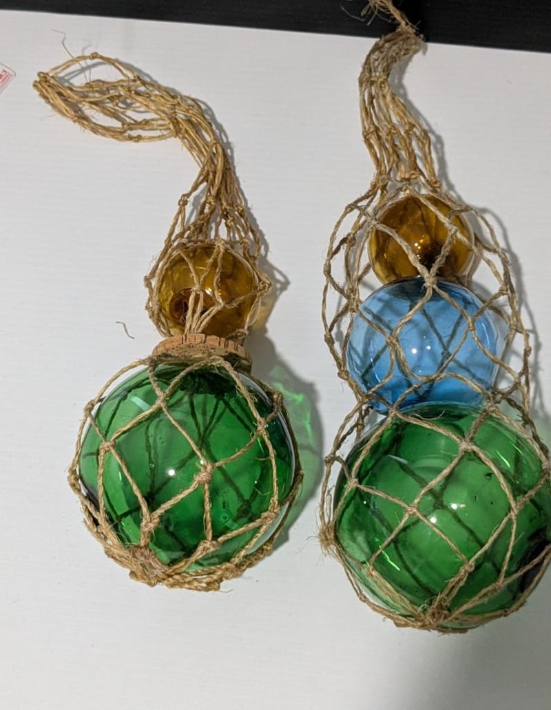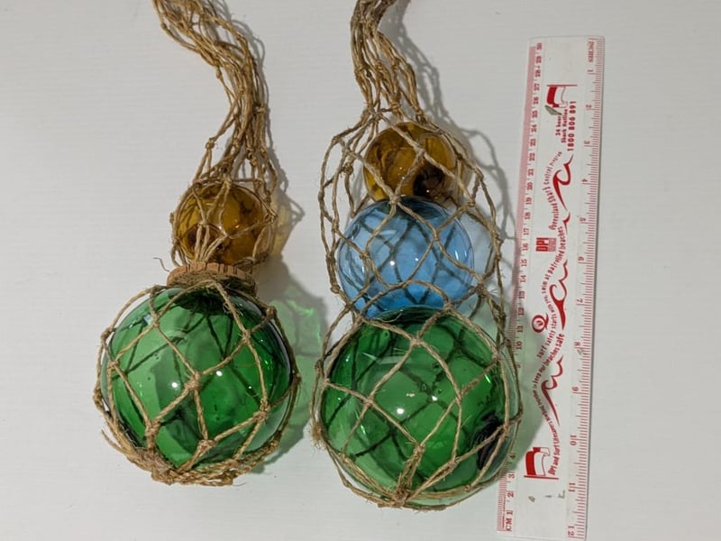NAUTICAL SMALL GLASS BUOYS, 30CM LONG FROM TOP OF STRING TO BASE