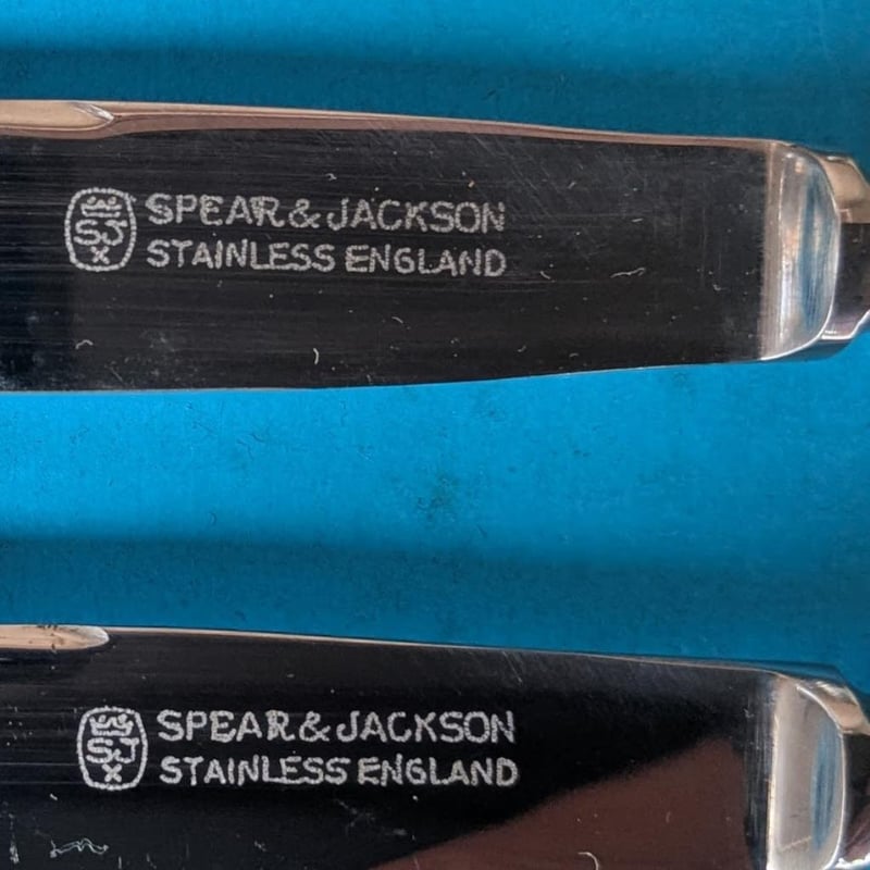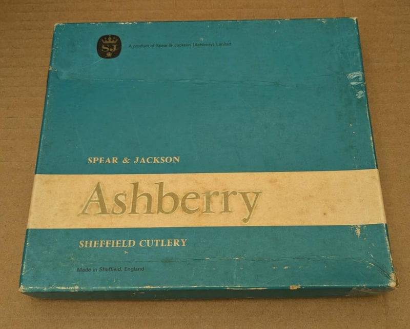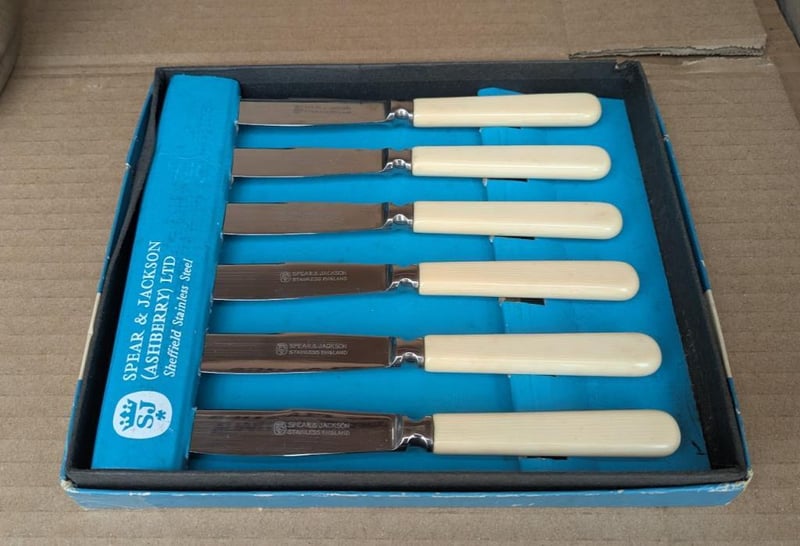 ASHBERRY SPEAR AND JACKSON SHEFFIELD ENGLAND STAINLESS STEEL TABLE KNIVES QTY 6 BOXED
