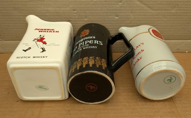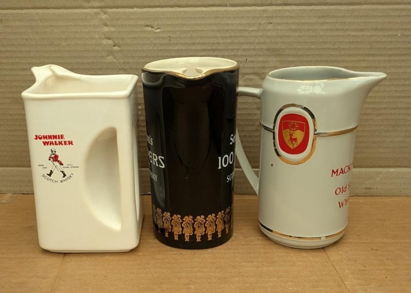 MANCAVE VINTAGE JOHNNY WALKER, 100 PIPERS AND MACKINLAY'S SCOTCH WHISKY ADVERTISING WATER JUG QTY 3 Condition: Good - Refer Images582898+12