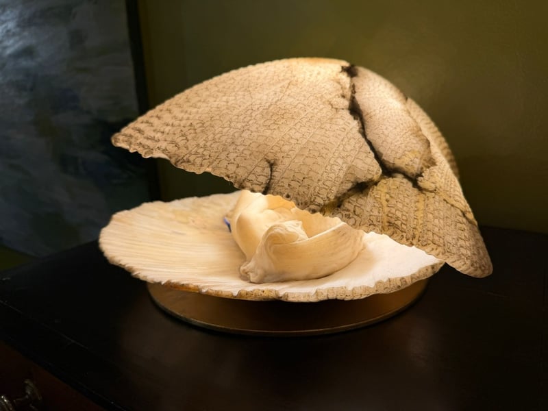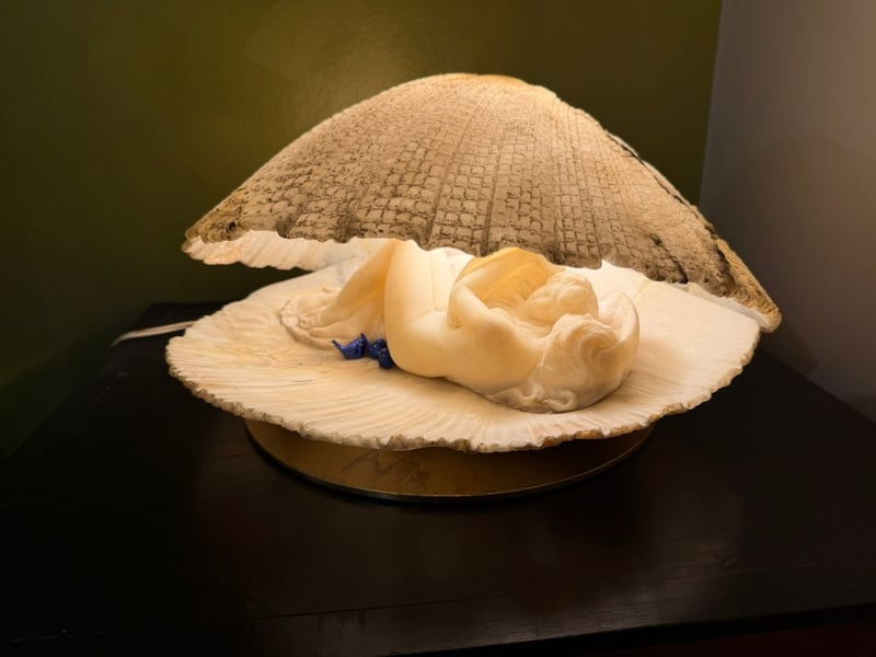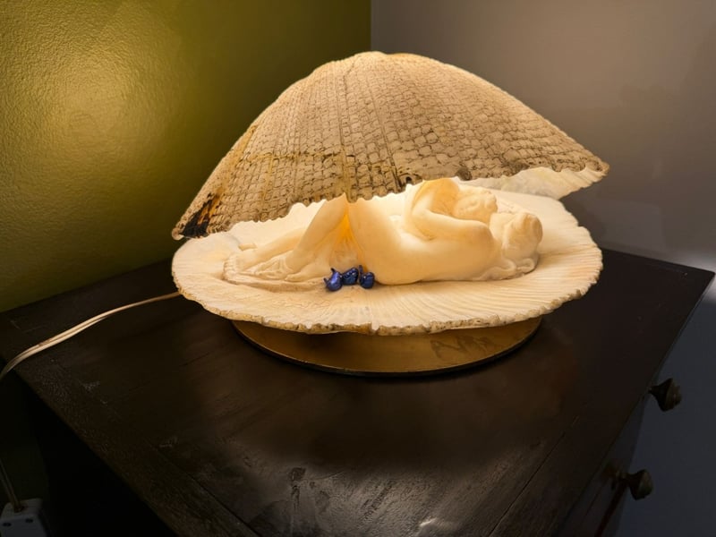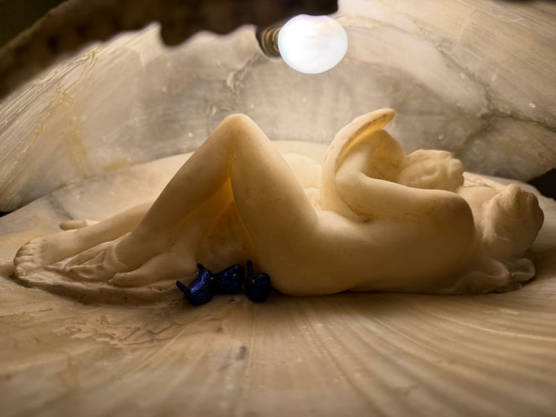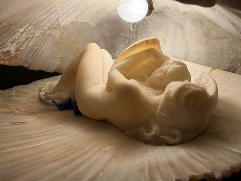 This Hand Carved Alabaster Light Is In Pristine Condition And Inside The Shell Is A Sculptured Women Being Held By An Angel - A Hand-Carved Alabaster “Clam Shell” Figural Lamp With A Woman And Angel Inside (Circa 1920) Fits Into The Art Nouveau / Early Art Decro Figural Lighting Category. This Piece Was Made In Italy Or France, Carved From Alabaster.