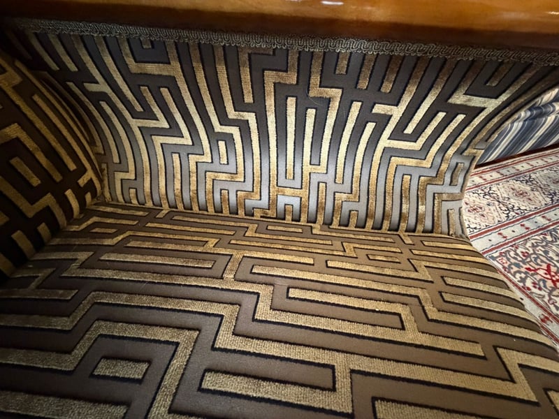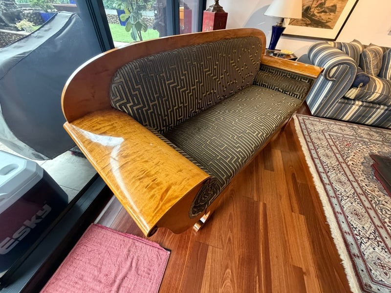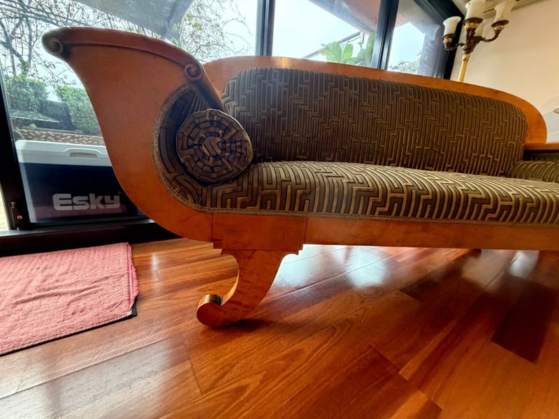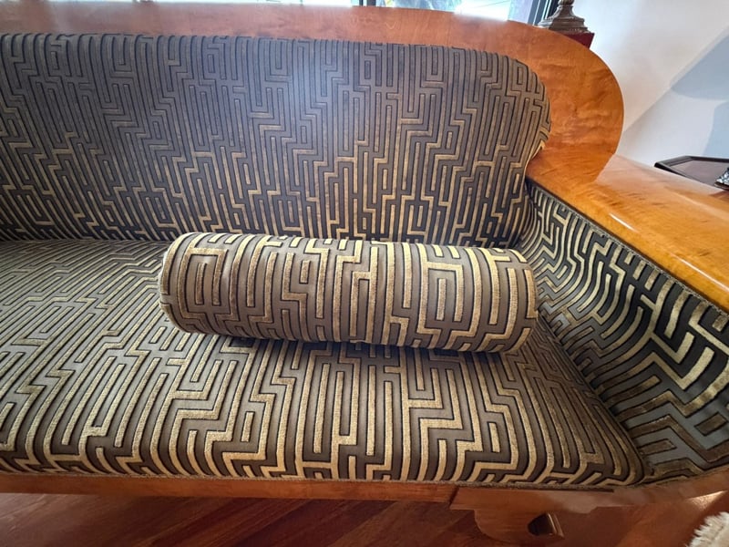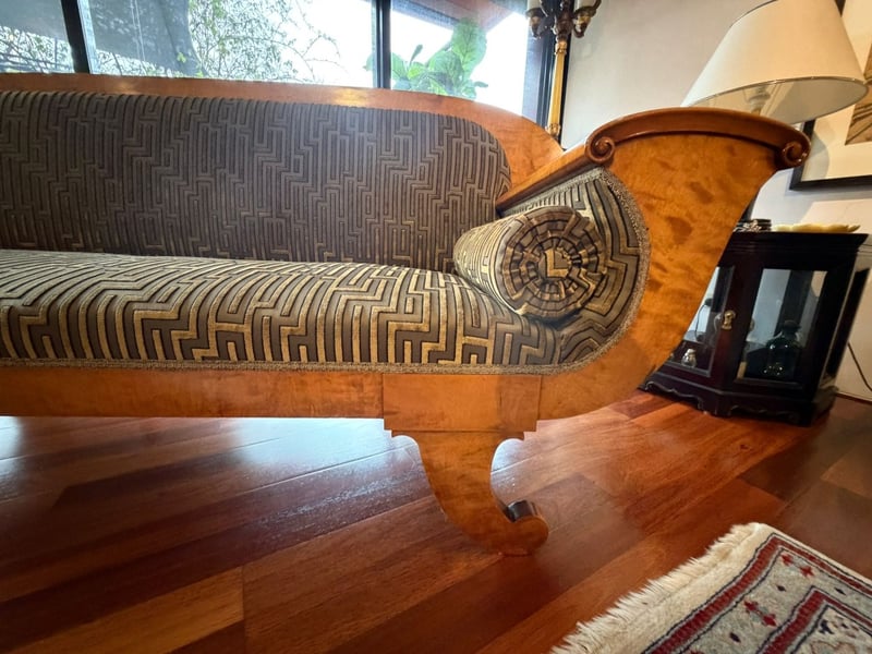 BIEDERMEIER FLAME BIRCH SOFA - WITH SUPERB WIDE ARMRESTS AND SWEEPING LEGS, REUPHOLSTERED IN AN IMPORTED REDELMAN FABRIC, AN EXTRAORDINARY PIECE.