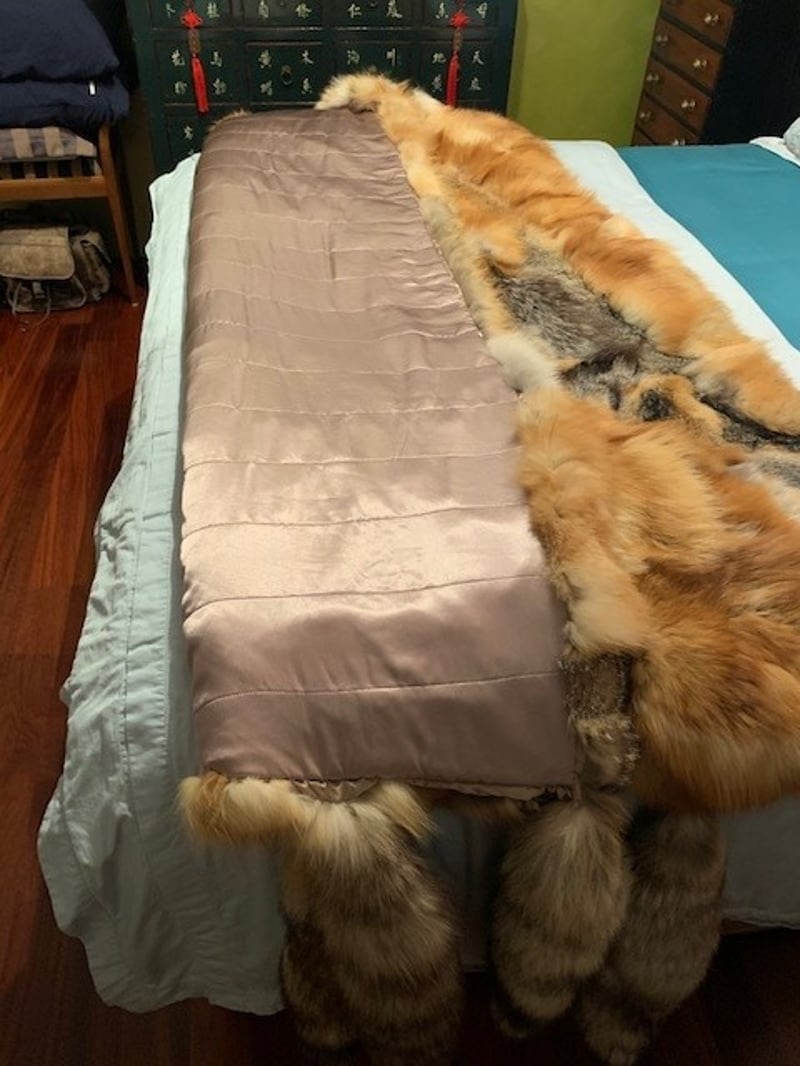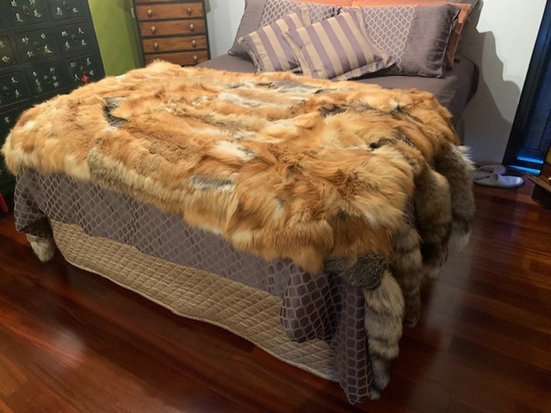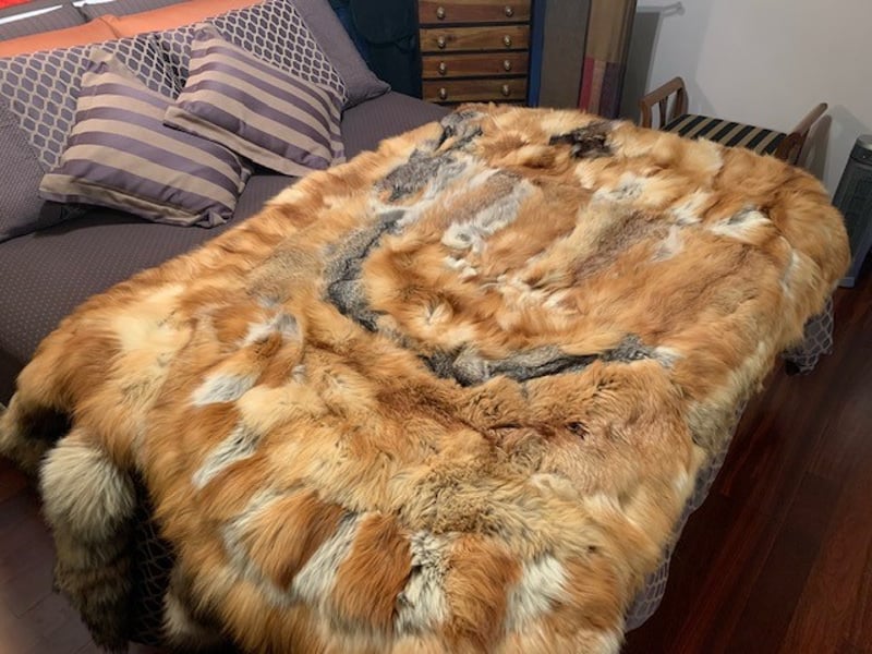 FOX FUR RED AND GREY BED COVER This Is The Equivalent Of 4 Full Length Fox Coats, This Piece Is Fully Lined And Hand Stitched. Please note: Listing is for the fox fur cover only; bed and other items shown are not included. 488539+5