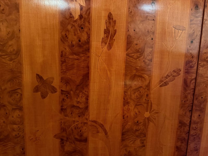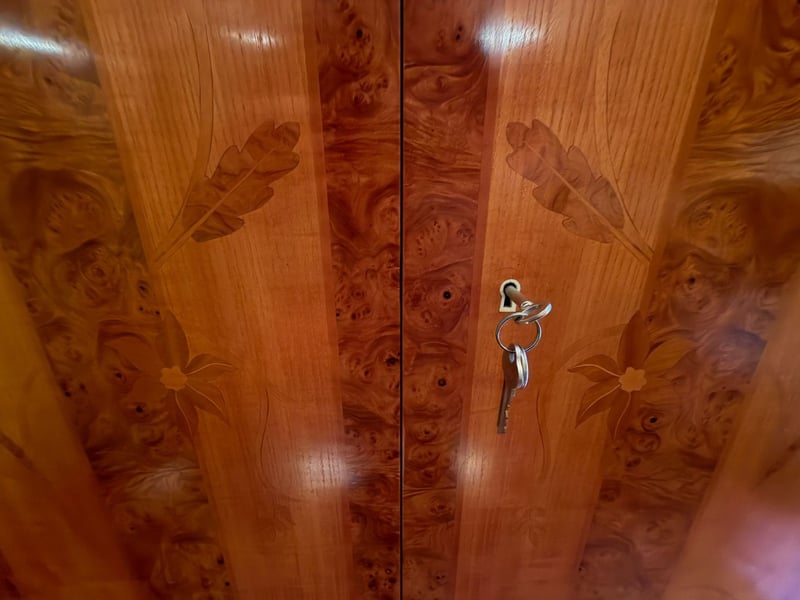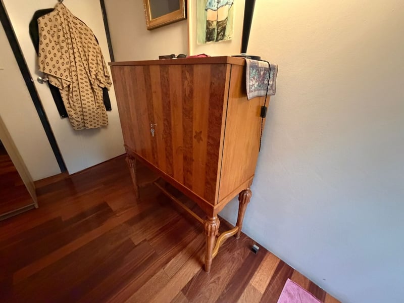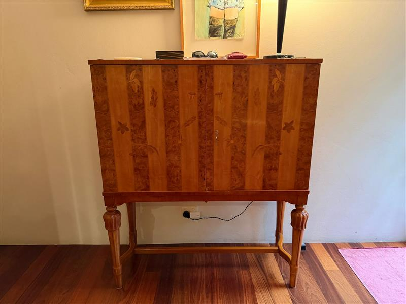 ART DECO SIDE CABINET -GERMAN PRIVATE COLLECTION. IT IS A TRUE CIRCA 1910, AND IT MAY ACTUALLY BE LATE ART NOUVEAU / EARLY TRANSITIONAL FURNITURE, THIS LARGE GERMAN ART DECO DRINKS / COCKTAIL SIDE CABINET WITH A PULL-OUT MIXING OR SERVING PANEL THIS IS A COLLECTIBLE TYPE OF FURNITURE.Description Cocktail Cabinet:Burr Walnut Exotic VeneerPull-Out Mixing Or Serving TrayBakelite FittingsWith Original Keys And ShelvesLarge Cabinets With These Features Were Designed For Home Entertaining, Often Storing Glasses, Bottles, And Mixing Tools.488539+8