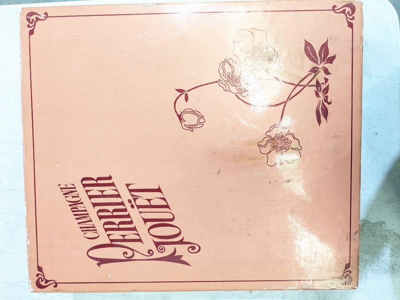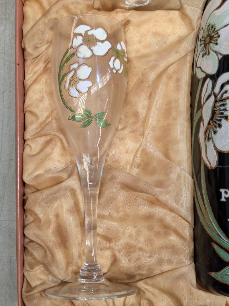 Prestigious 1979 Perrier-Jouët Belle Époque Champagne Bottle With Original Presentation Box Containing Four Hand-Painted Floral Champagne Flutes Featuring Delicate White Flower Motifs With Green Foliage Detailing On Clear Crystal Stems. Bottle Features Iconic Black Glass With White Enamelled Anemone Design Characteristic Of Belle Époque Aesthetic. Wooden Presentation Box With Copper Wire Handles. Vintage French Champagne Gift Set In Original Condition.