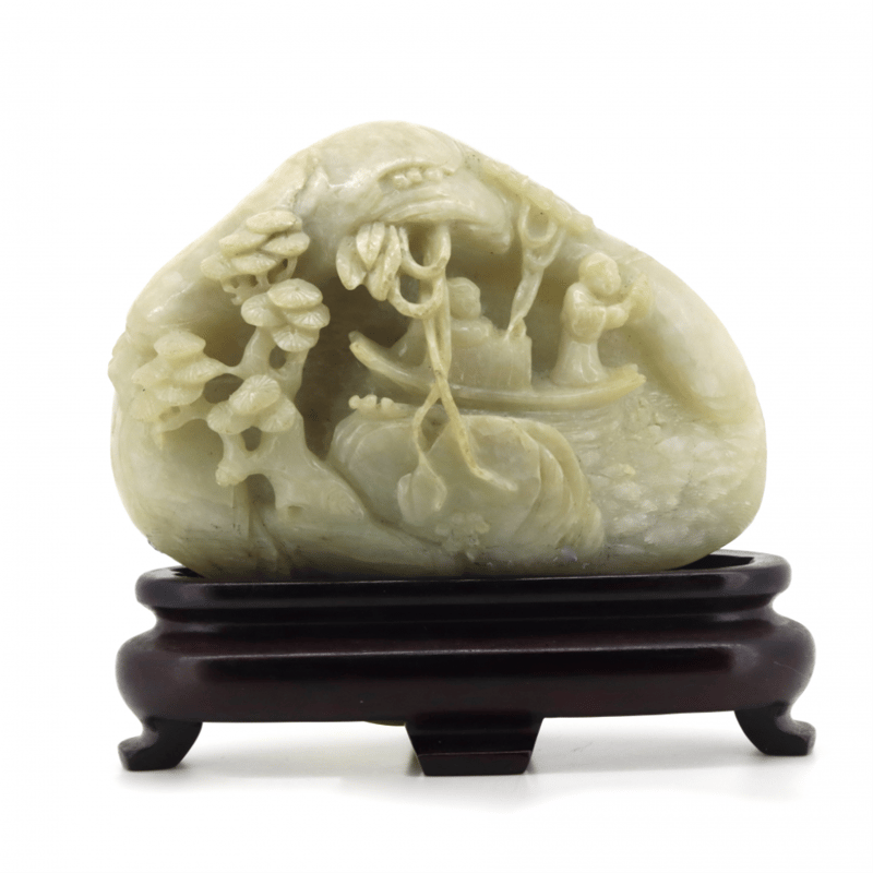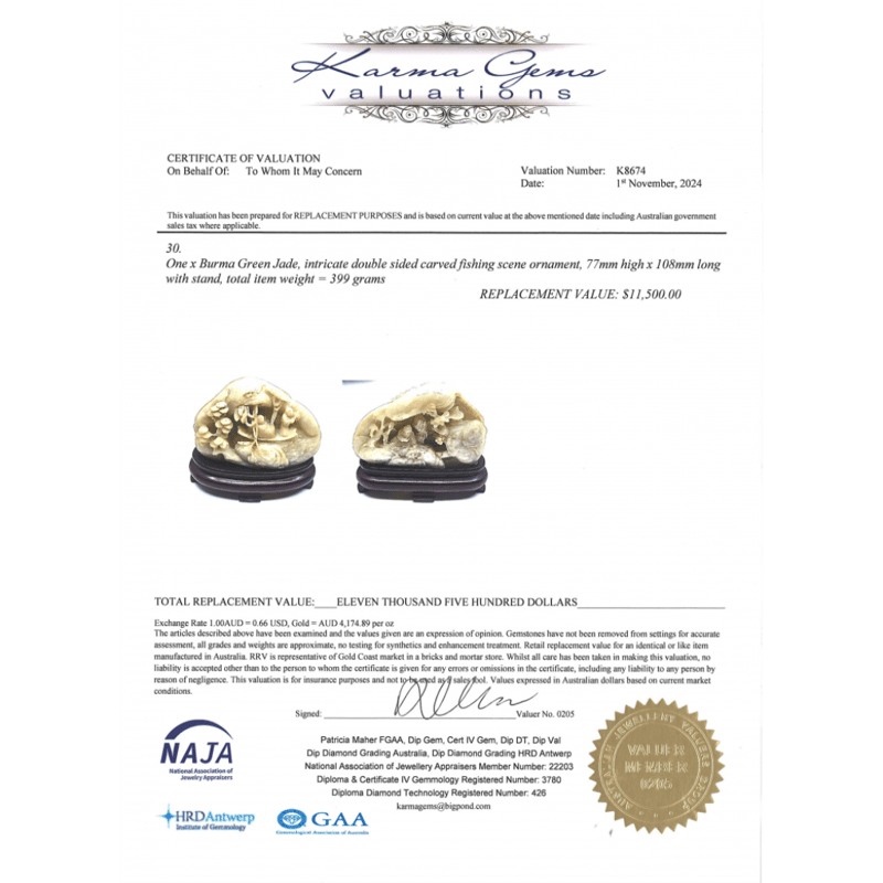 NATURAL BURMESE JADE, DOUBLE-SIDED, INTRICATE CARVING. FISHING SCENE ORNAMENT.