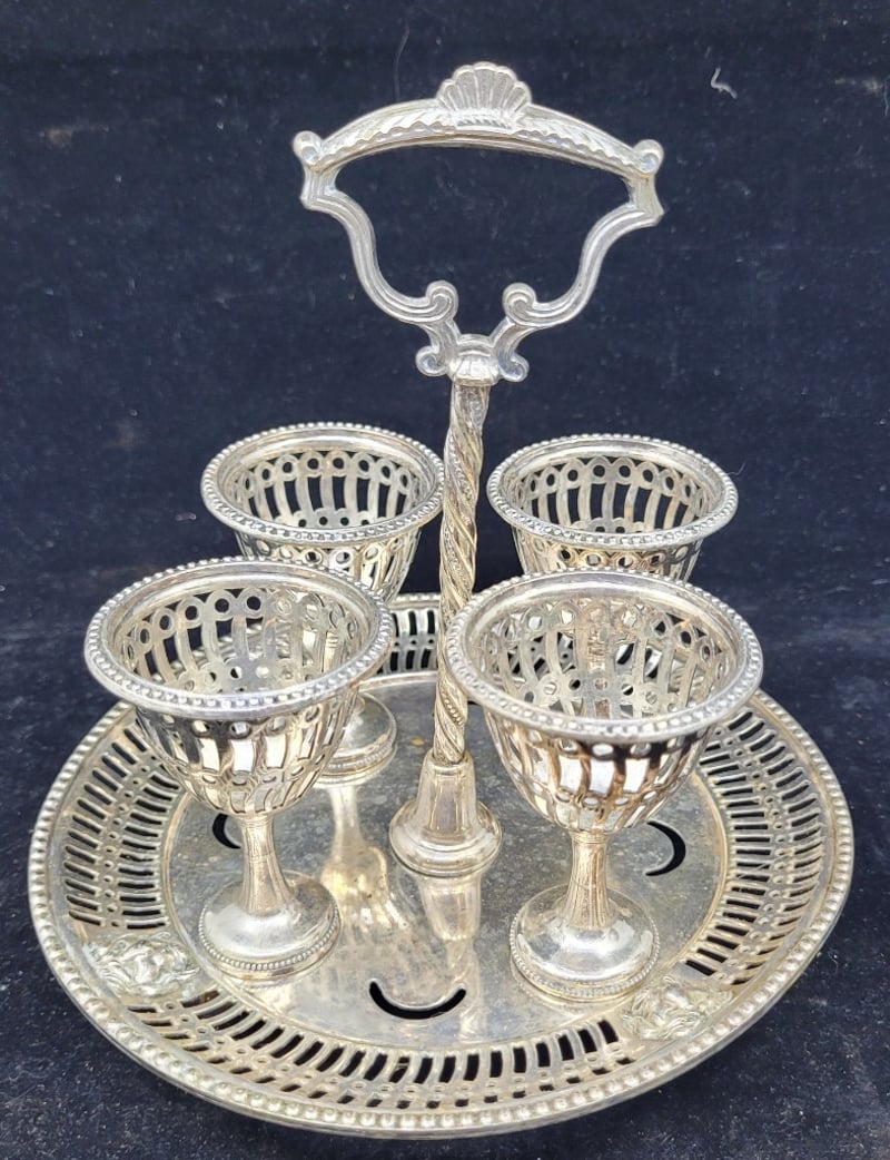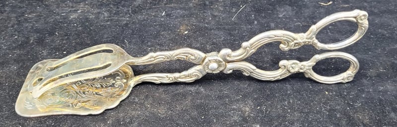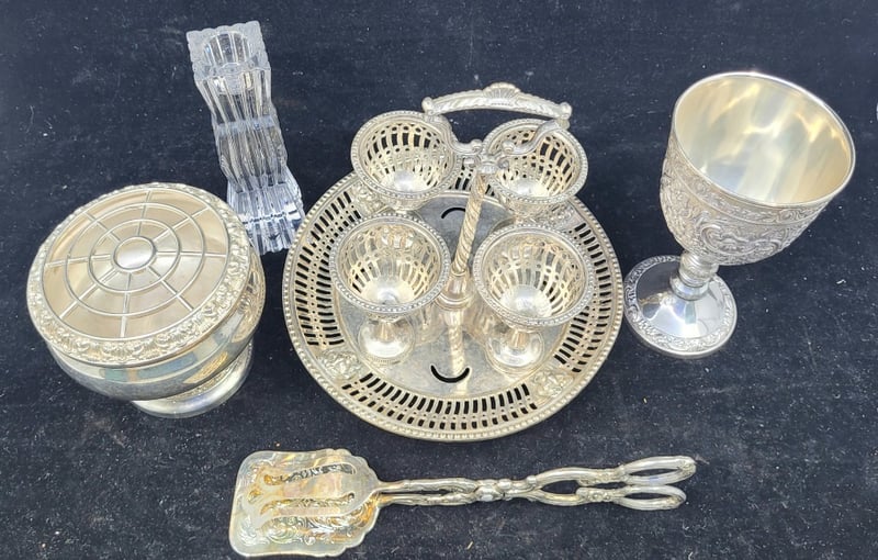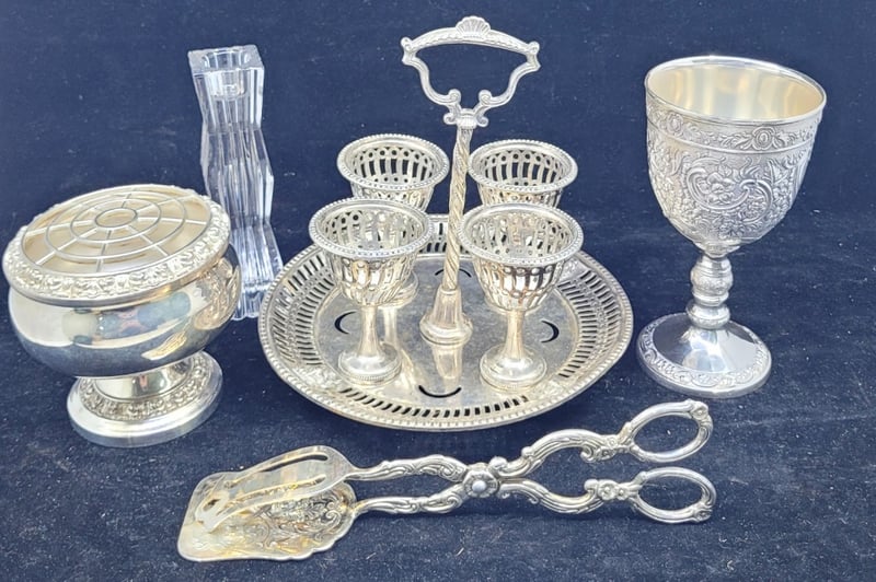 COLLECTION OF PEWTER SERVINGWAREIncludes:Egg Cruet Set, Cake/Pastry Tongs, Candle Holder, Lanthe Rose Bowl,, GobletCondition: Good - Refer To Images582910+6
